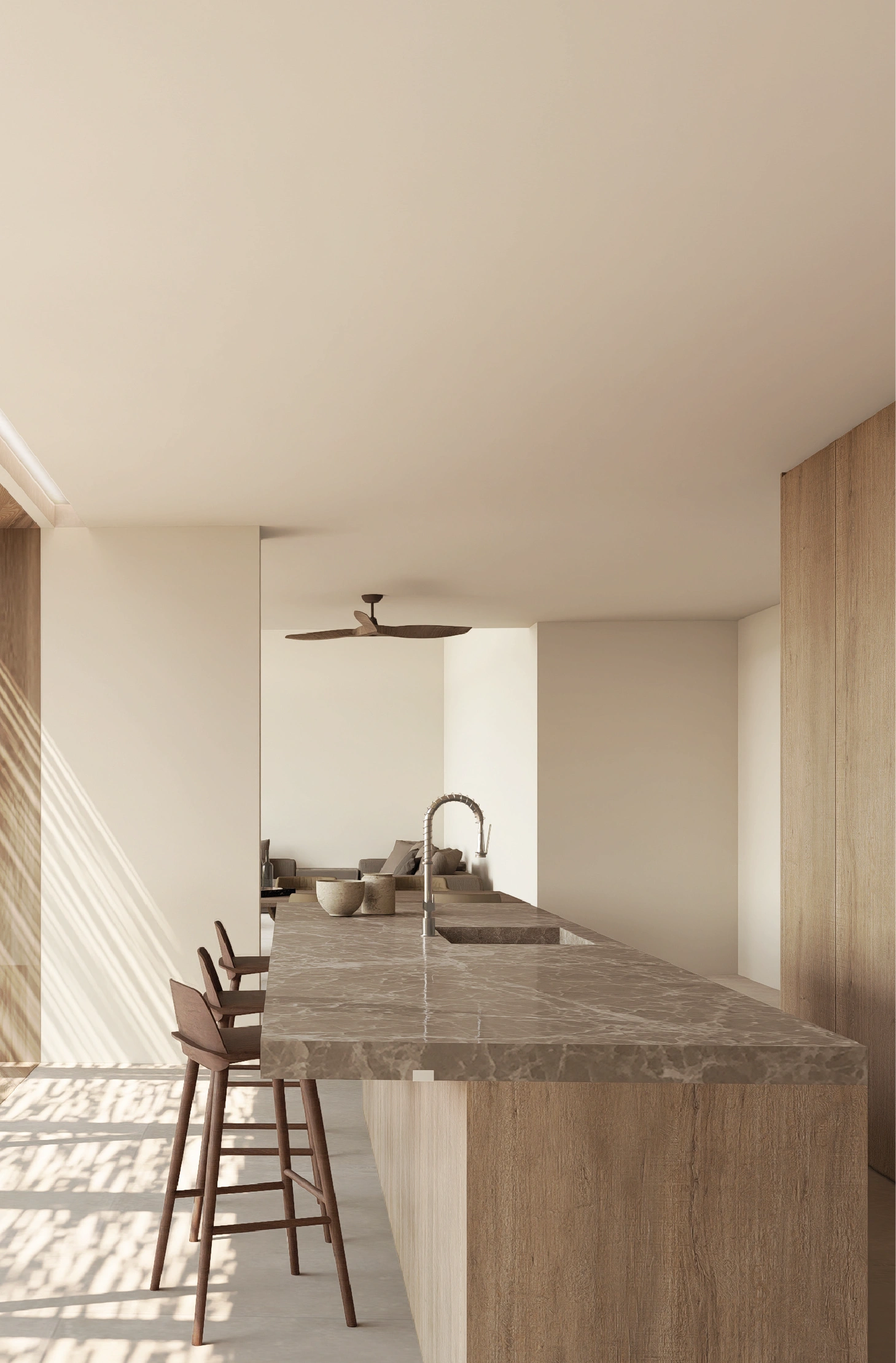 Large openings allow natural light to enter throughout the day. Therefore, the interior feels bright and connected to the surrounding landscape.