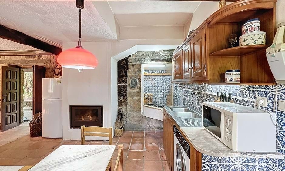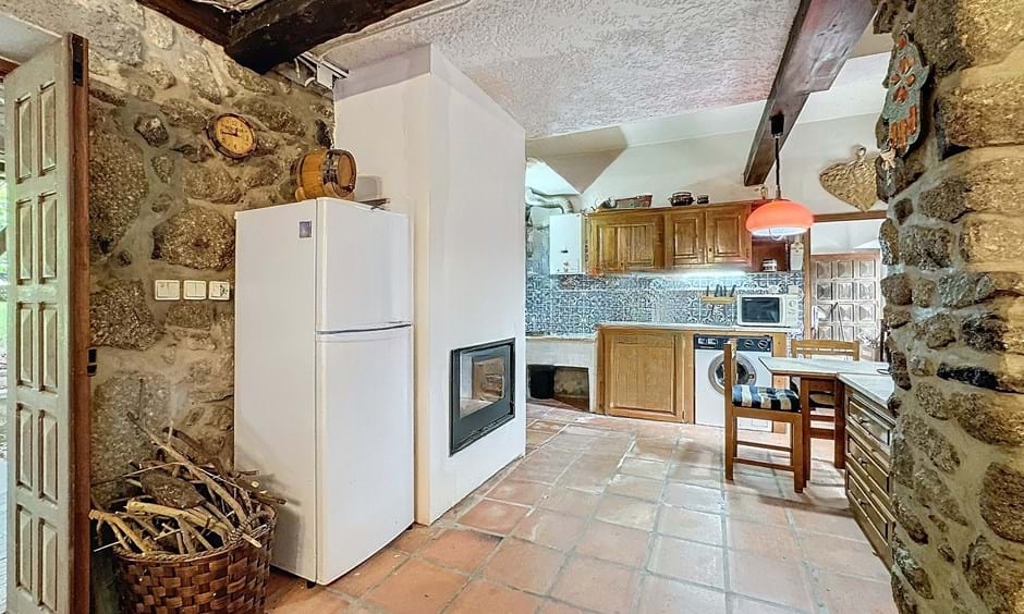 The house includes a gas fireplace, which adds warmth and character. It also features gas central heating for year-round comfort. In addition, two water wells support the property—one for irrigation and one for consumption. The fitted kitchen ensures immediate usability.