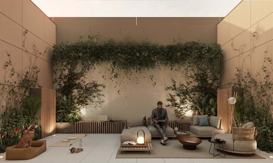 Additionally, two private patios of 32 m² each extend the living space outdoors. As such, they enhance natural light and create areas for relaxation.