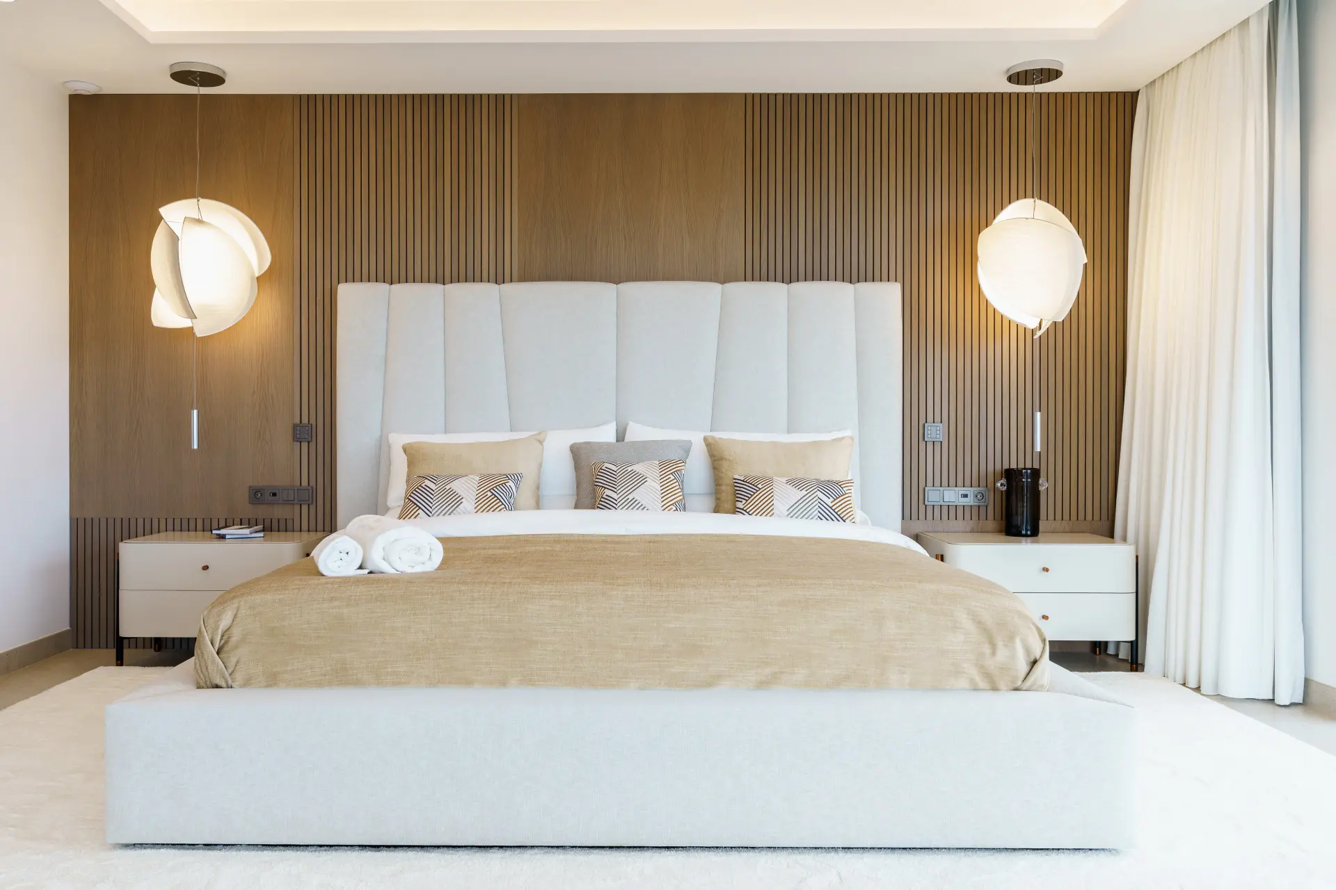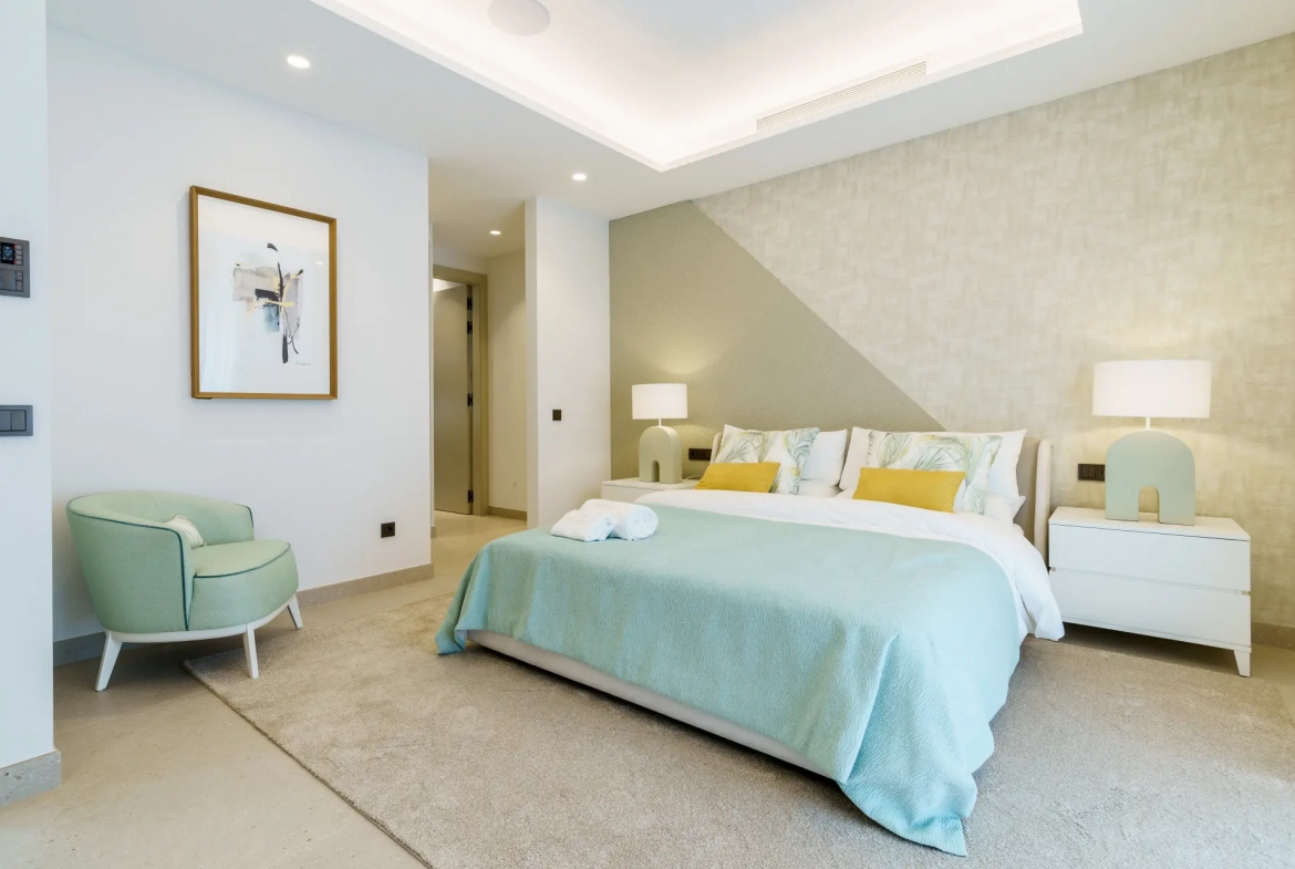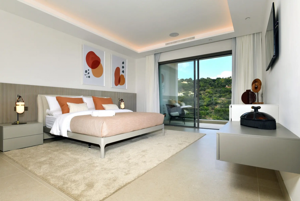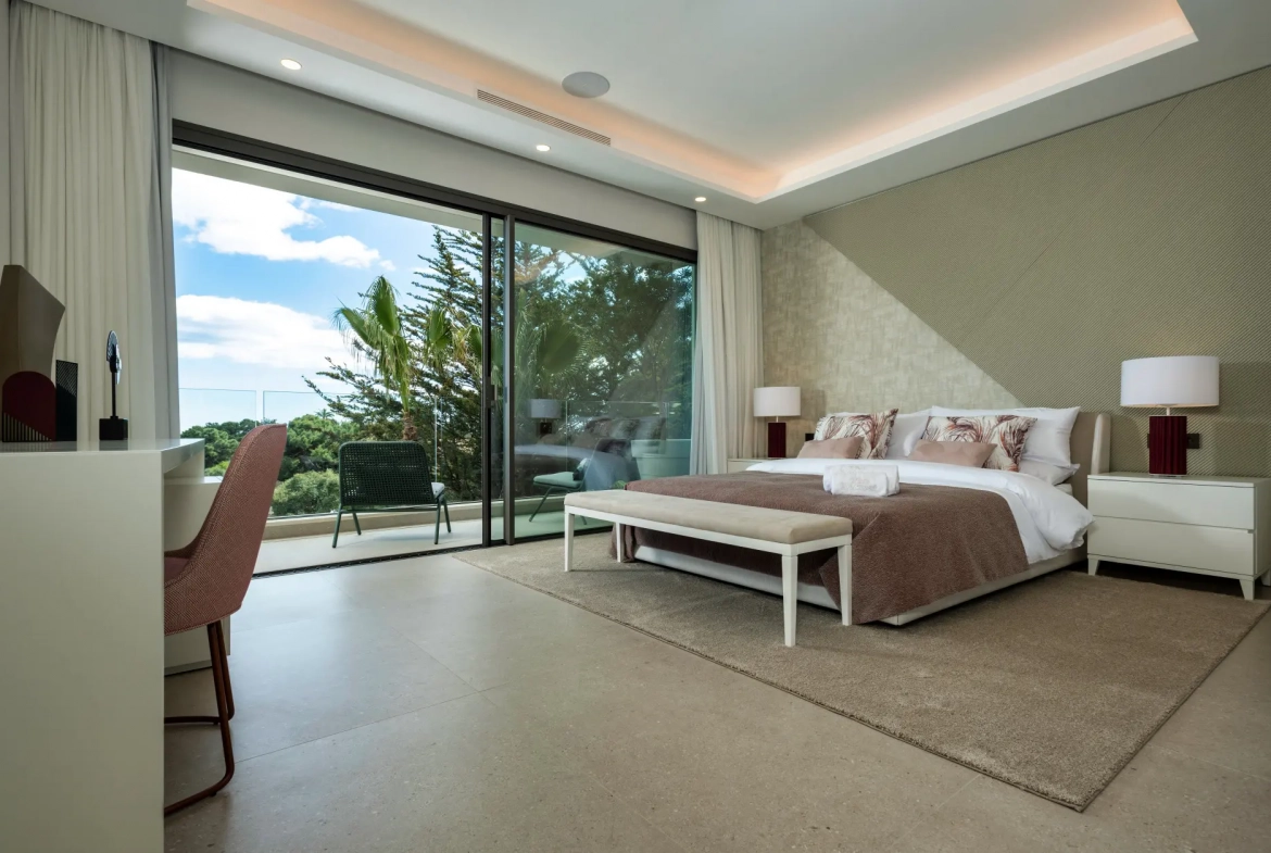 The first floor divides into two private wings, ensuring optimal privacy and spatial harmony. One wing accommodates the expansive master suite, which enjoys panoramic views across the Mediterranean landscape. The suite includes separate his-and-hers bathrooms and generous walk-in wardrobes. In addition, another guest suite occupies this wing.