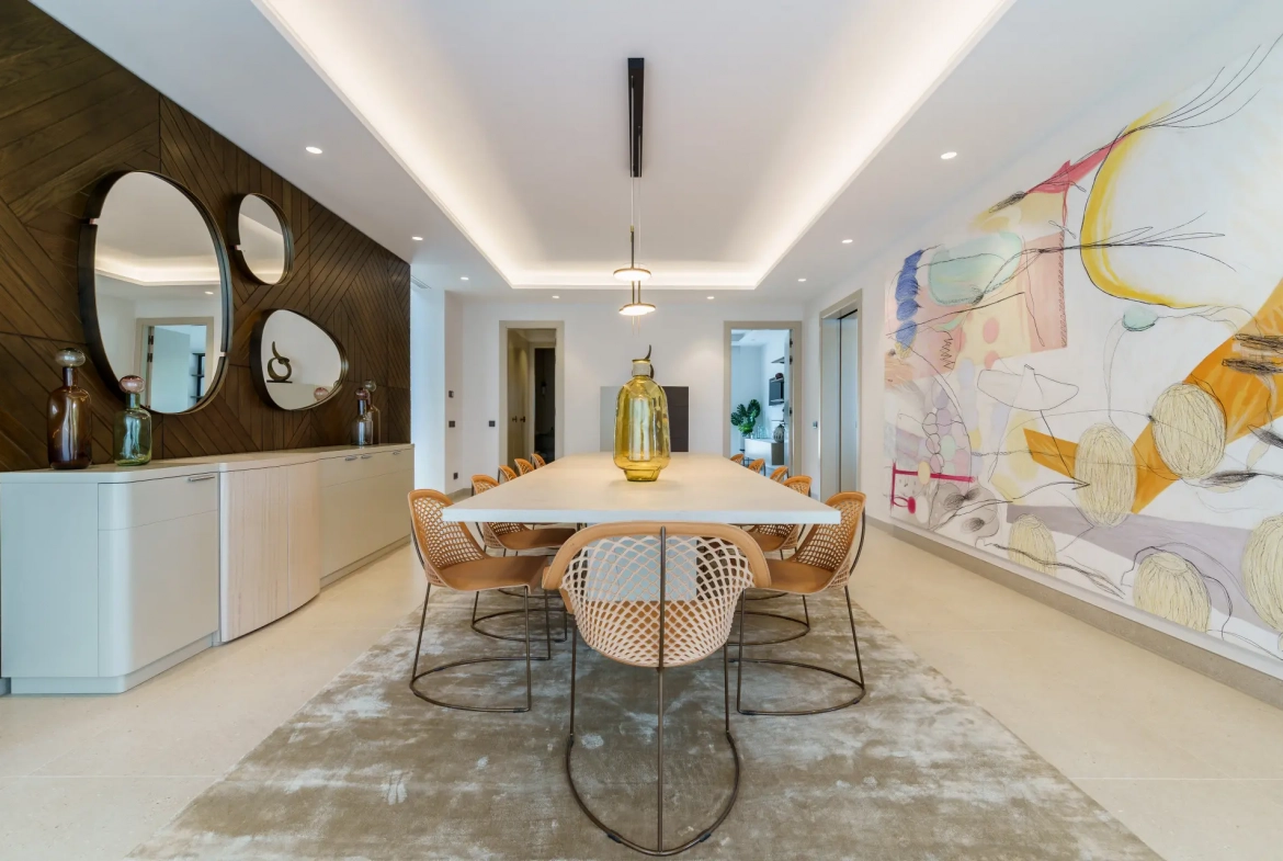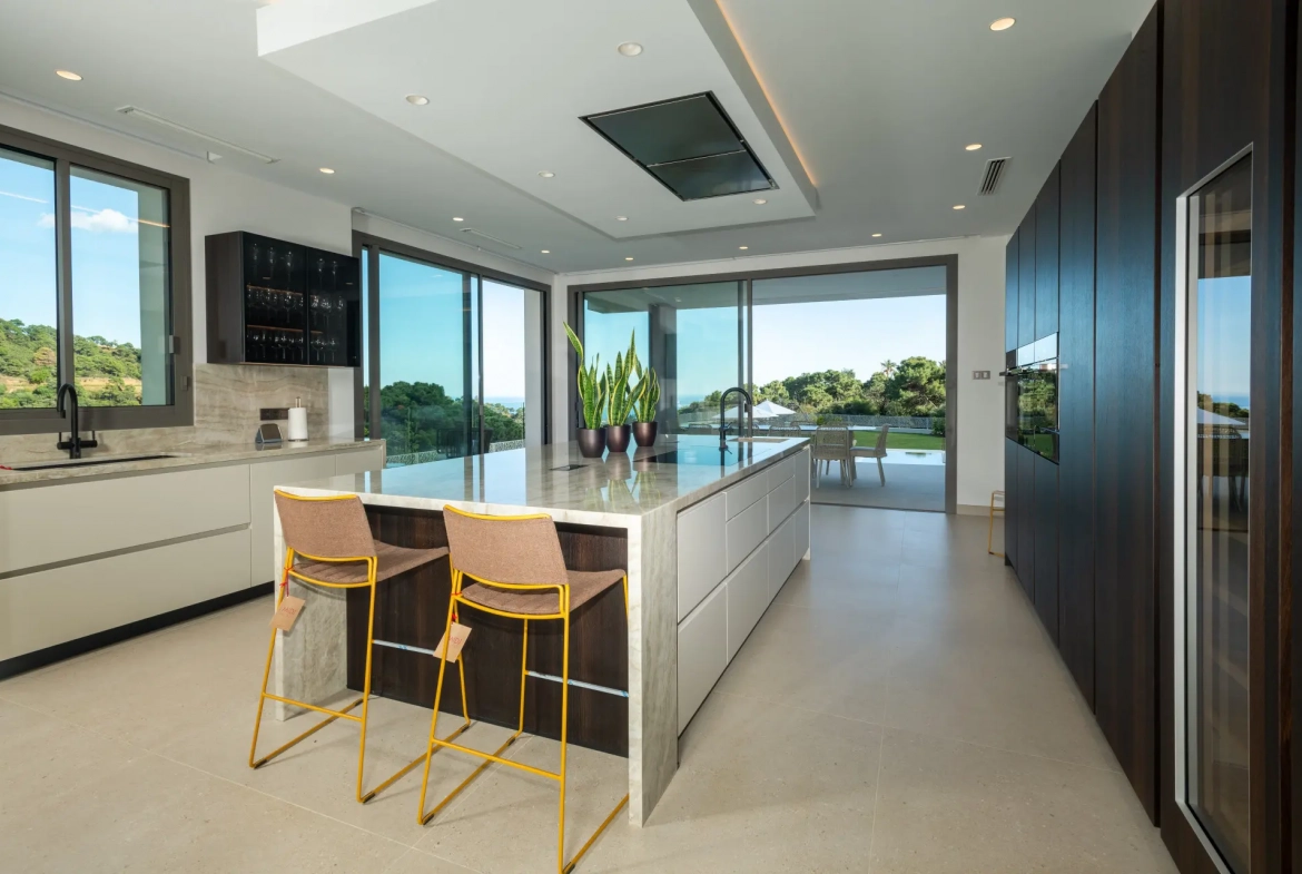 The primary living level showcases a refined combination of scale, light, and functionality. Here, a formal living room, an elegant dining area for twelve guests, and a spacious designer kitchen create the heart of the home. The kitchen features top-of-the-range appliances, a central cooking island, and a distinctive floating dining table. Furthermore, floor-to-ceiling windows flood the interiors with natural light while capturing uninterrupted views of the sea and surrounding landscape.