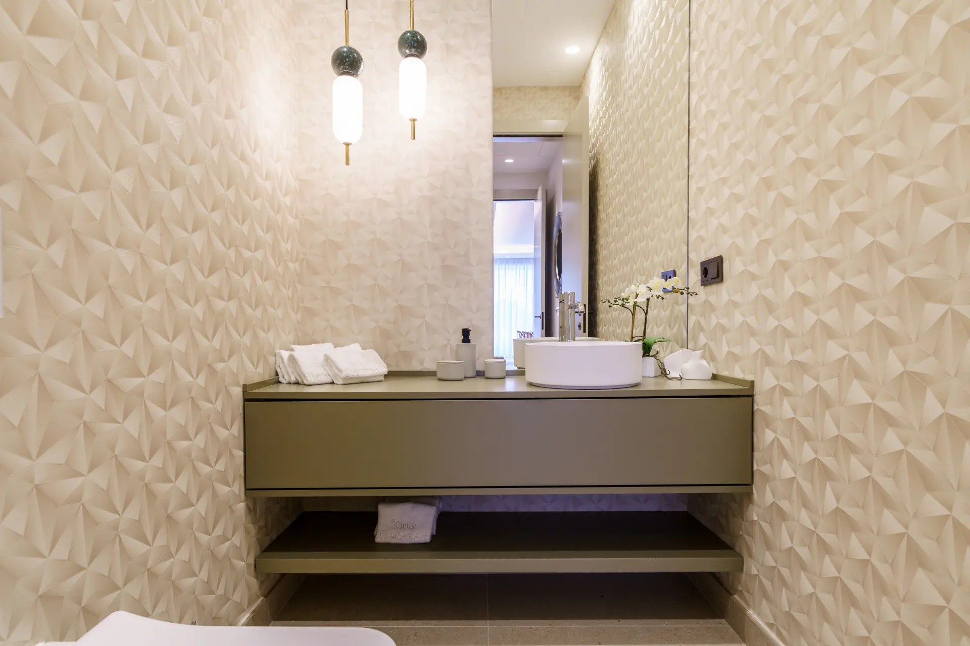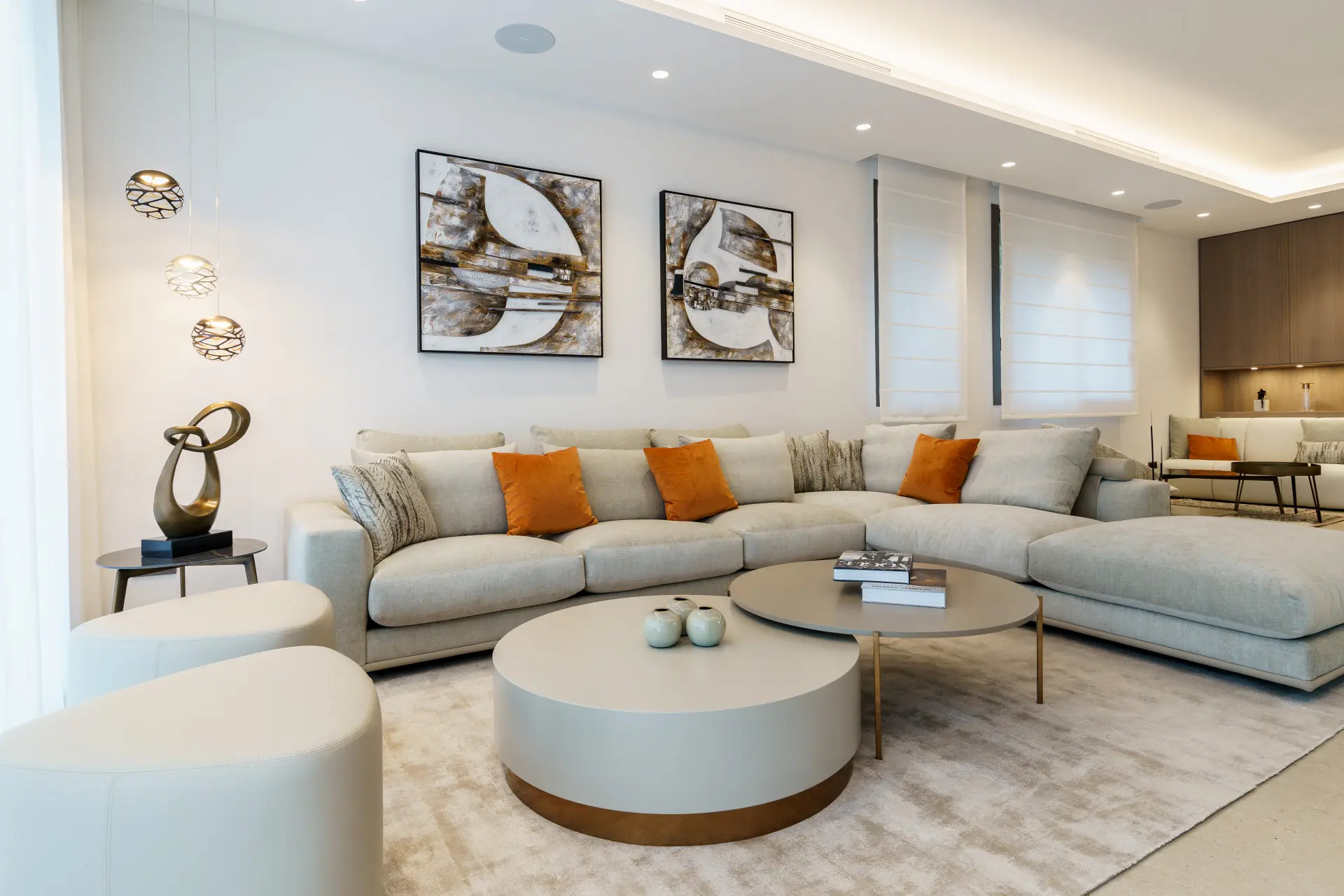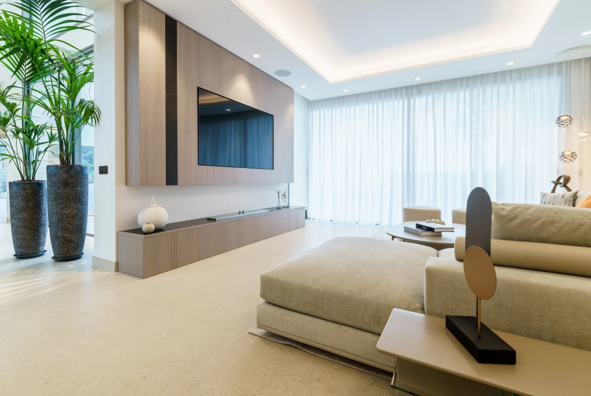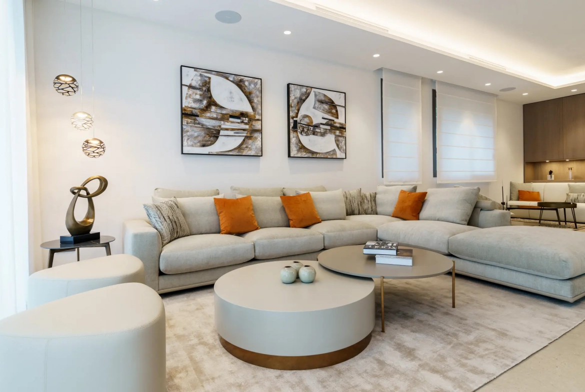 Upon entering, the La Zagaleta villa reveals a majestic reception hall crowned by a double-height ceiling. A remarkable loft-style floating staircase becomes the architectural centerpiece, extending upward toward the rooftop solarium and reinforcing the home’s contemporary elegance.