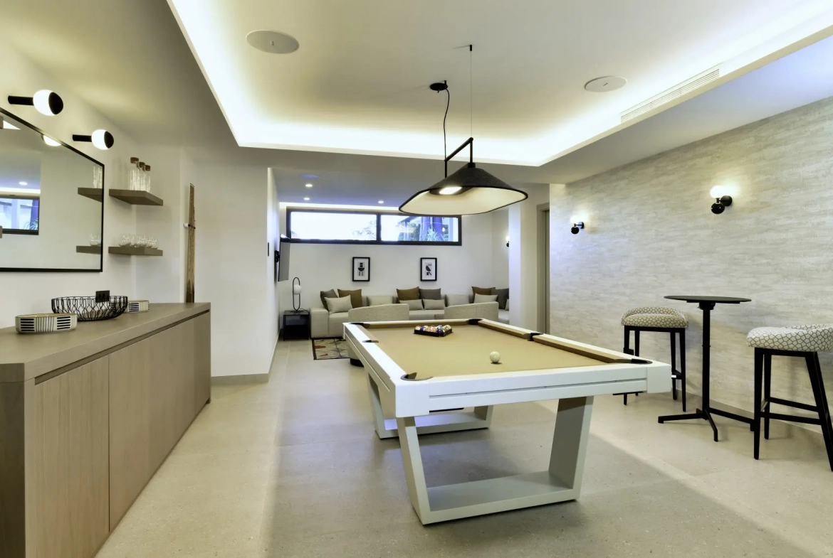 The lower level transforms the residence into a private retreat dedicated to wellness and leisure. This area features a spectacular indoor spa complete with a heated swimming pool and advanced counter-current swimming system. Moreover, the spa includes a sauna, steam room, changing area, and full bathroom, delivering a true resort-style experience.