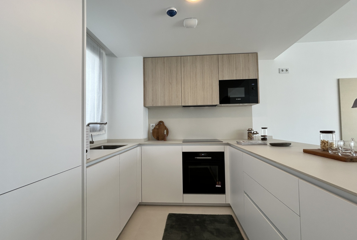 The penthouse features a modern open-plan layout, with the kitchen and living area seamlessly integrated into a bright and spacious environment.