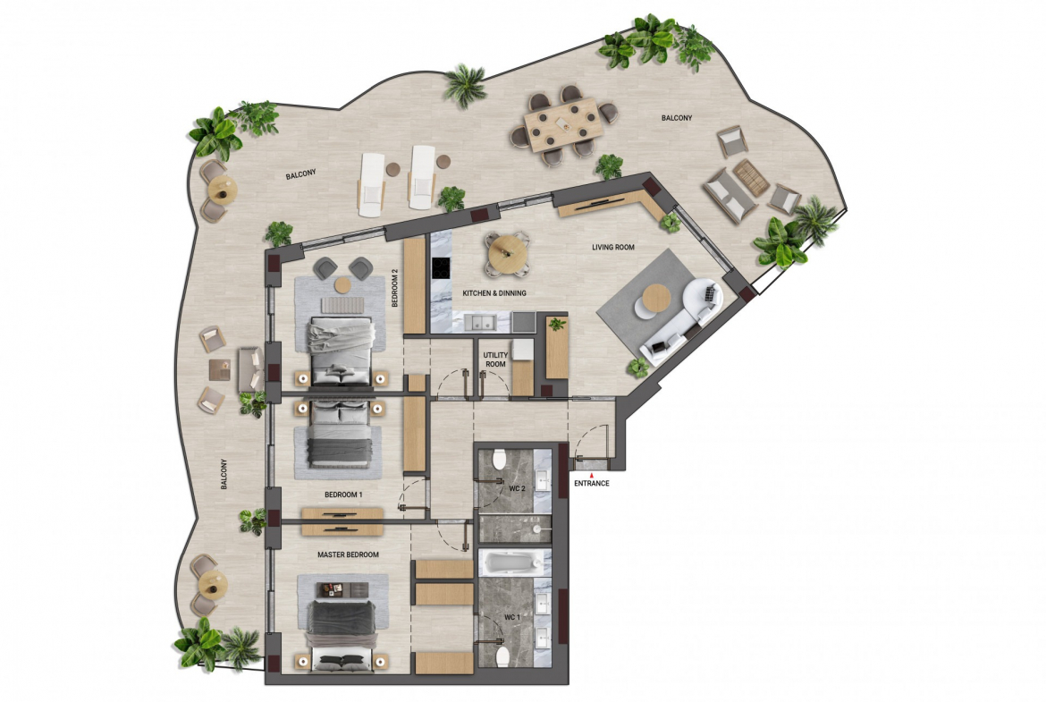 The development features a selection of studios, one-, two-, and three-bedroom apartments, as well as penthouses, all crafted to the highest standards. Floor-to-ceiling windows flood interiors with natural light, while premium finishes and energy-efficient layouts create a perfect balance of style and comfort.