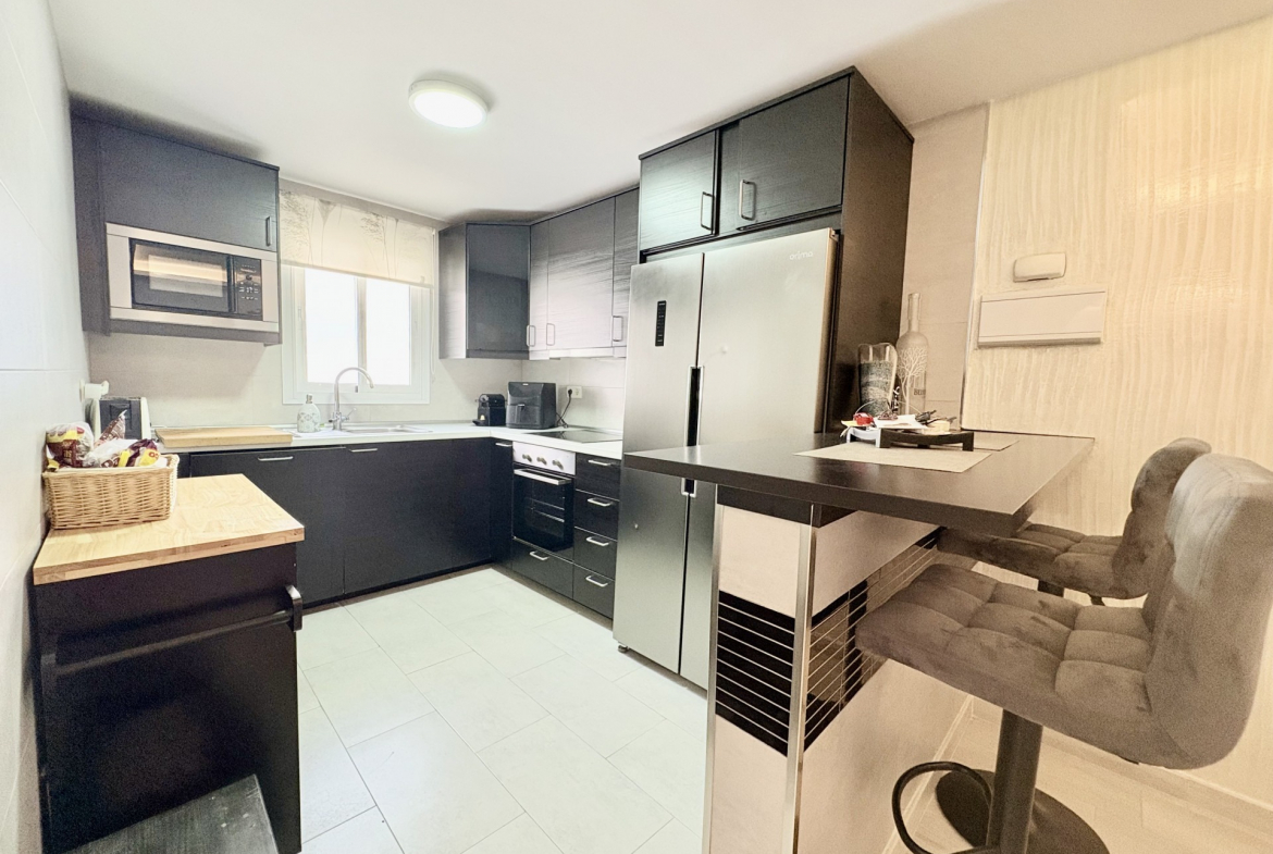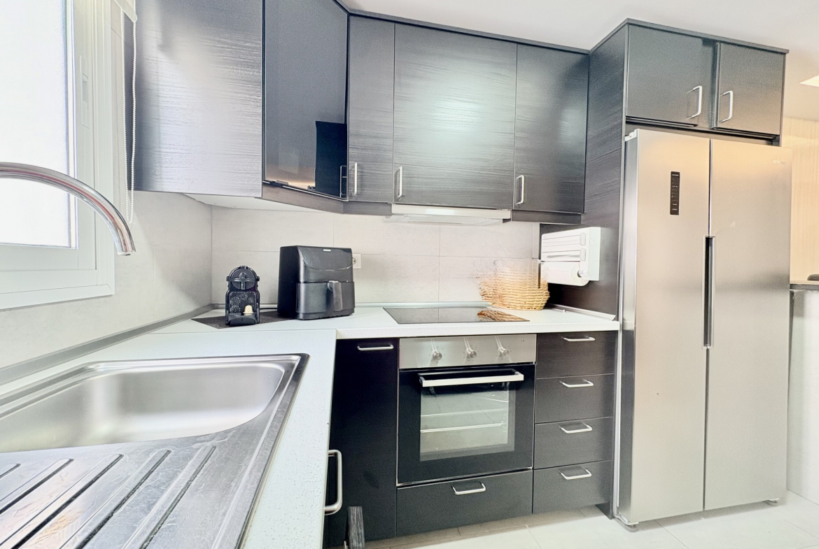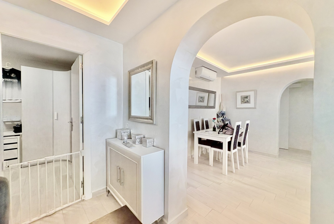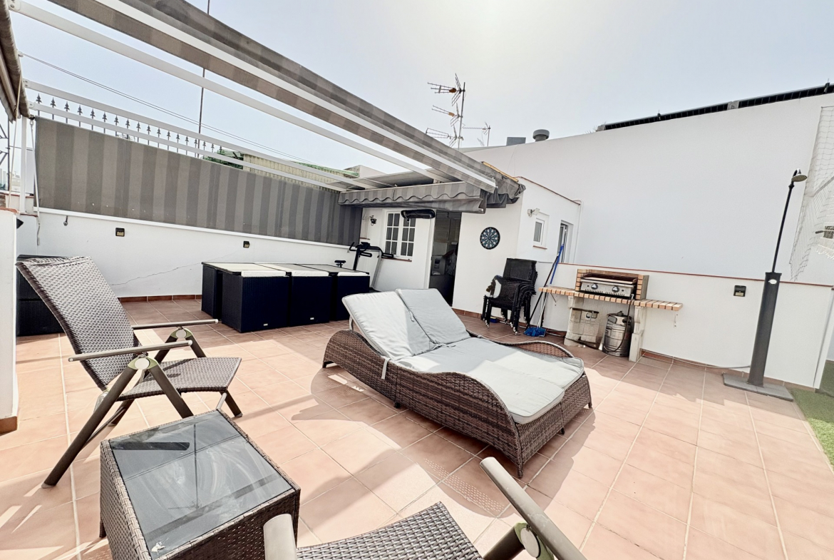 Fully renovated in 2019, the penthouse is distributed over two floors. The main level features a bright and spacious living and dining area, a modern fully fitted kitchen with a breakfast bar, three generous bedrooms with built-in wardrobes, and two bathrooms, including one en suite. Double-glazed windows and hot and cold air conditioning ensure comfort throughout the year.