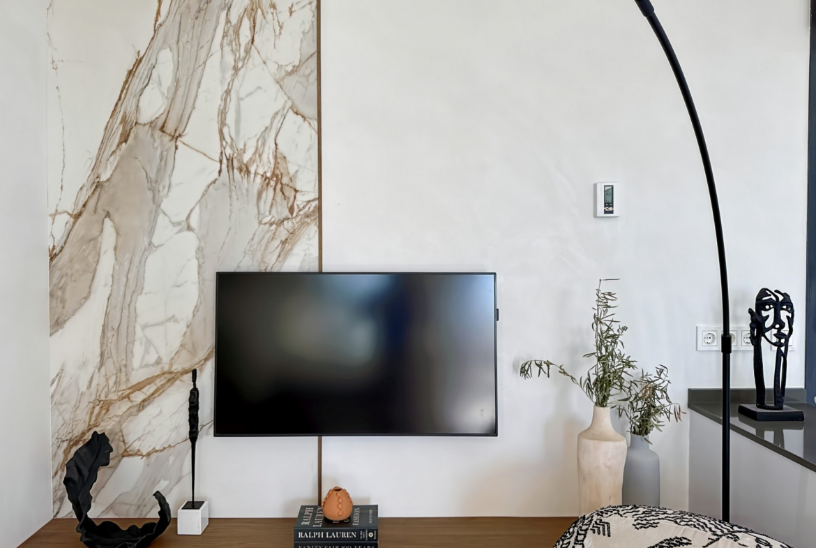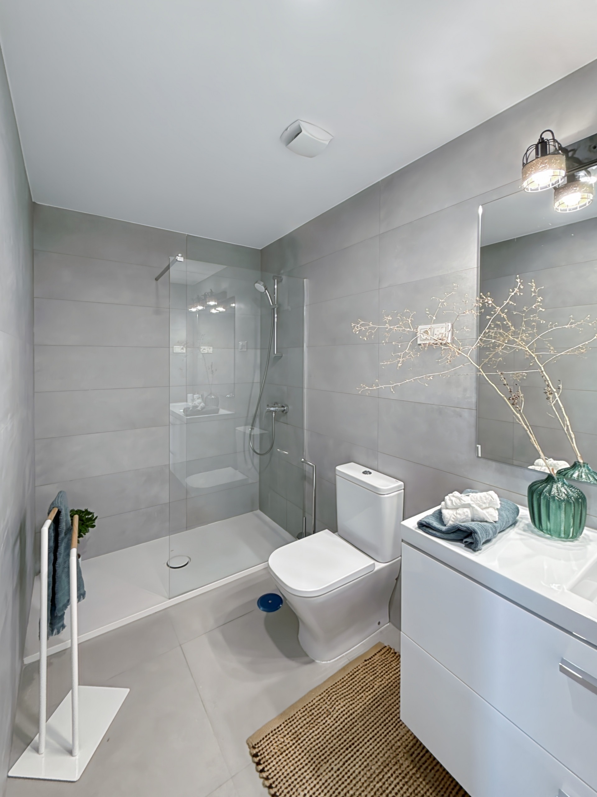 The property includes premium materials such as double-glazed PVC windows, motorised shutters, laminate flooring indoors, and non-slip ceramic tiles on the terrace. Climate control is managed through an efficient aerothermal system.