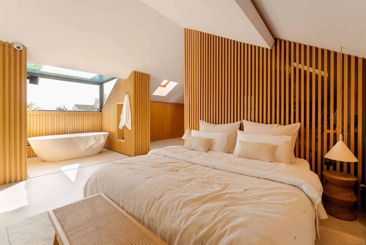 The lower level features a spacious open-plan living and dining area with direct access to a large south-facing terrace, ideal for entertaining and outdoor living. Natural wood elements and clean lines create a sophisticated and welcoming atmosphere.