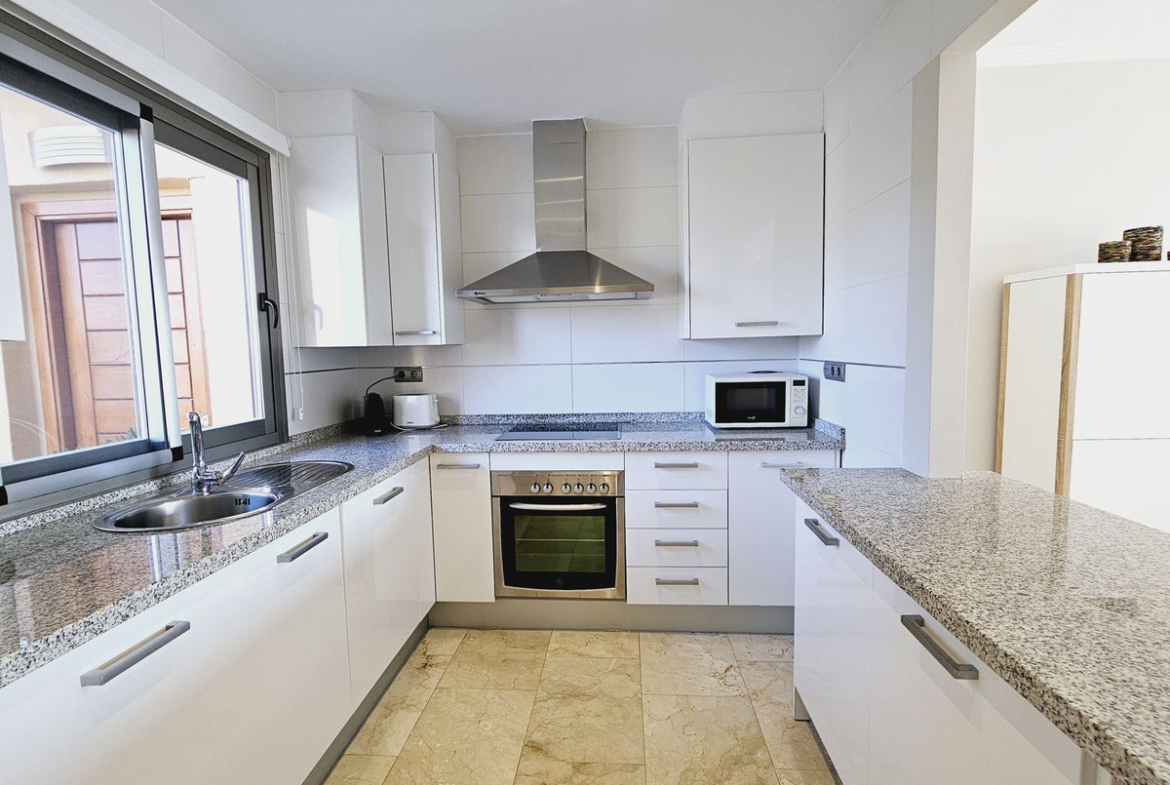The apartment is built on one level, making it ideal for easy living without stairs. Upon entering, you are welcomed by a modern, fully fitted semi open-plan kitchen that connects seamlessly to a bright and spacious living area.