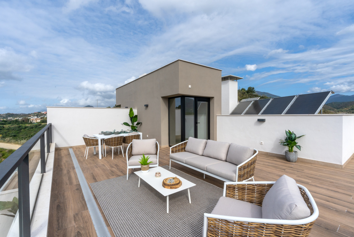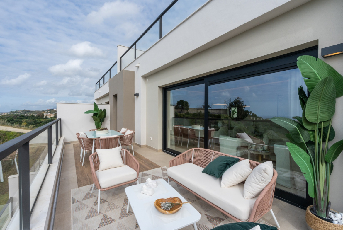 The penthouse features a large private terrace, offering breathtaking views of the Viejo del Ángel reservoir, Marbella coastline, and surrounding golf courses.