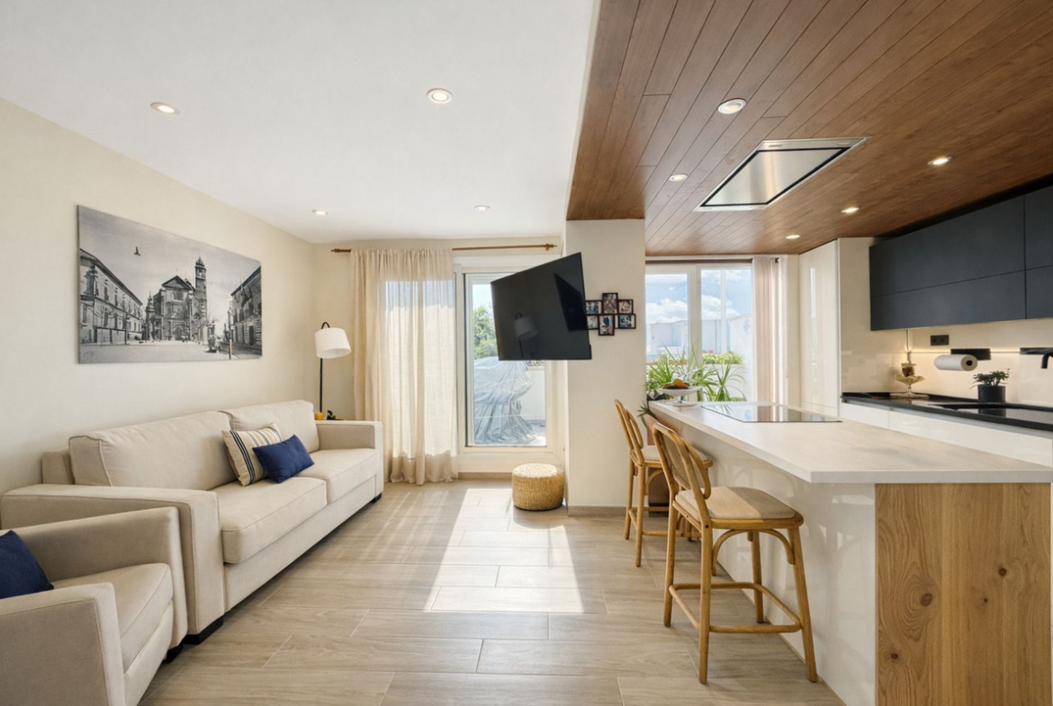Distributed over two levels, the apartment has been thoughtfully designed to separate social and private living areas, enhancing both comfort and practicality.