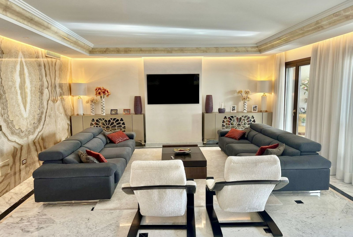 The main level offers a bright and spacious living room with striking marble feature walls and a large fireplace, alongside a separate dining room with large windows and direct terrace access. The layout is designed for both comfort and entertaining.