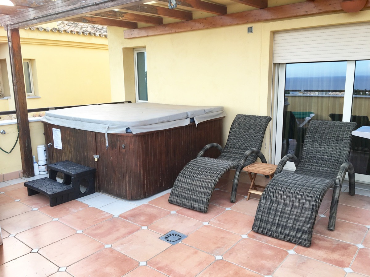 The property boasts a large south-facing terrace with a jacuzzi, offering breathtaking panoramic views over the green valley towards the Mediterranean Sea.