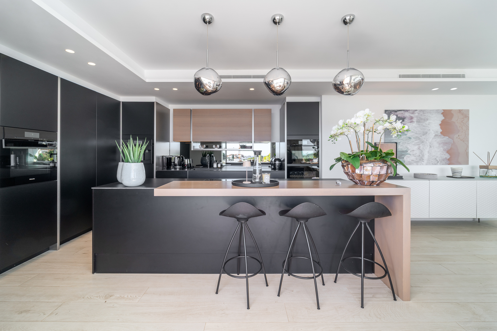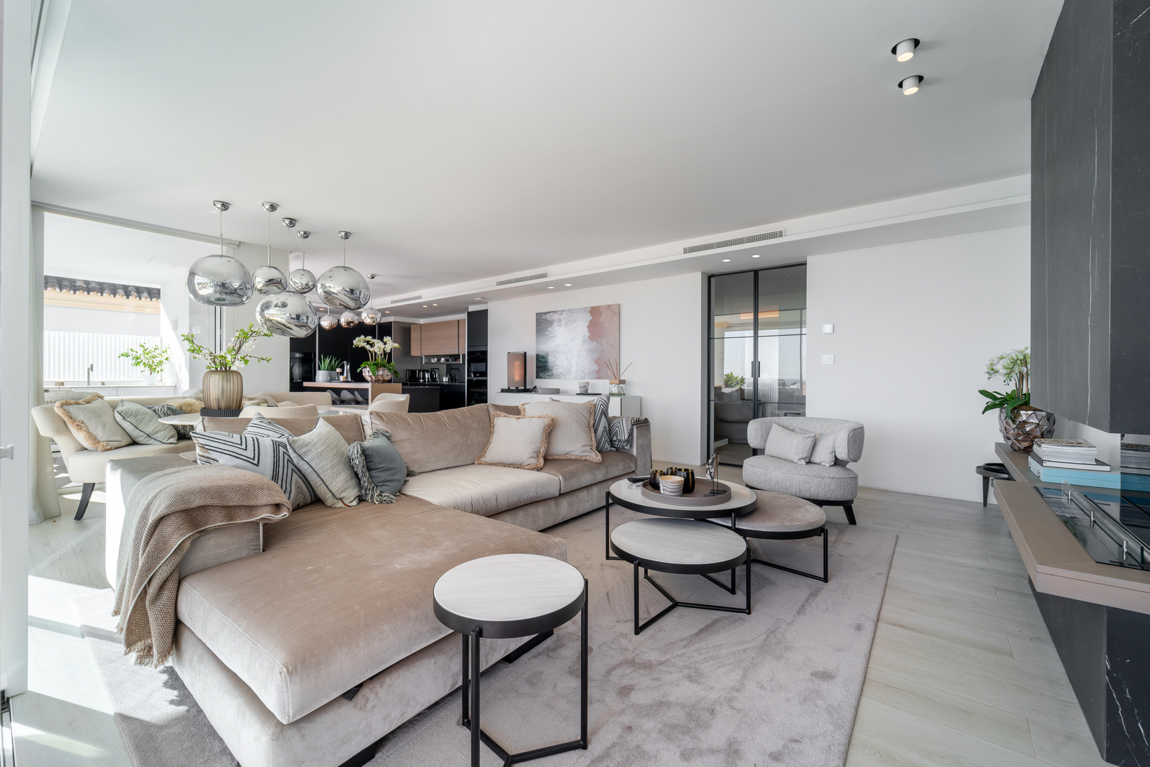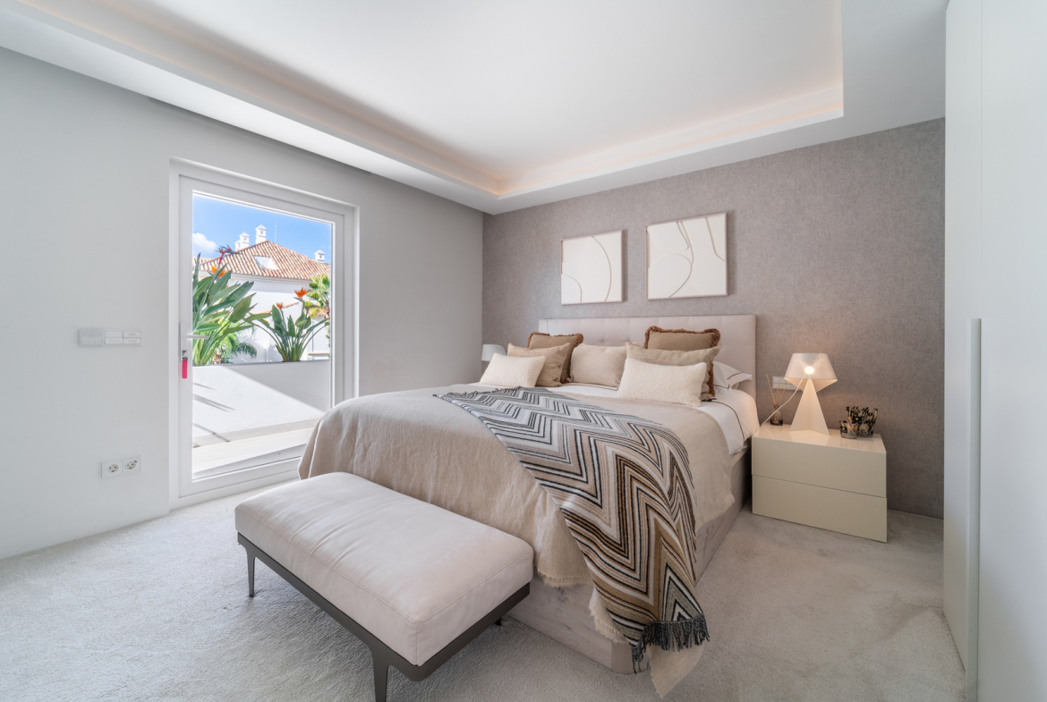 Following a complete high-spec refurbishment, the home reveals a clean, contemporary aesthetic. Generous glazing, therefore, enhances natural light while strengthening the connection to the outdoors. The open-plan living and dining area centres around a bioethanol fireplace and, in addition, opens directly onto a spacious terrace. From here, panoramic views of the Mediterranean Sea and La Concha Mountain unfold, delivering a spectacular backdrop both day and night.