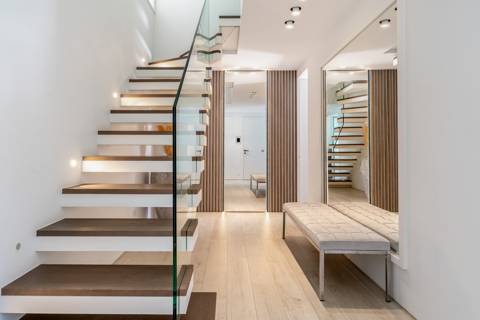 On the entrance level, two elegant en-suite bedrooms provide comfort and privacy for family or visitors. One bedroom also benefits from its own west-facing terrace, perfect for enjoying afternoon sun. A carefully appointed guest cloakroom, along with premium bathroom fittings, further reflects the property’s refined finish.