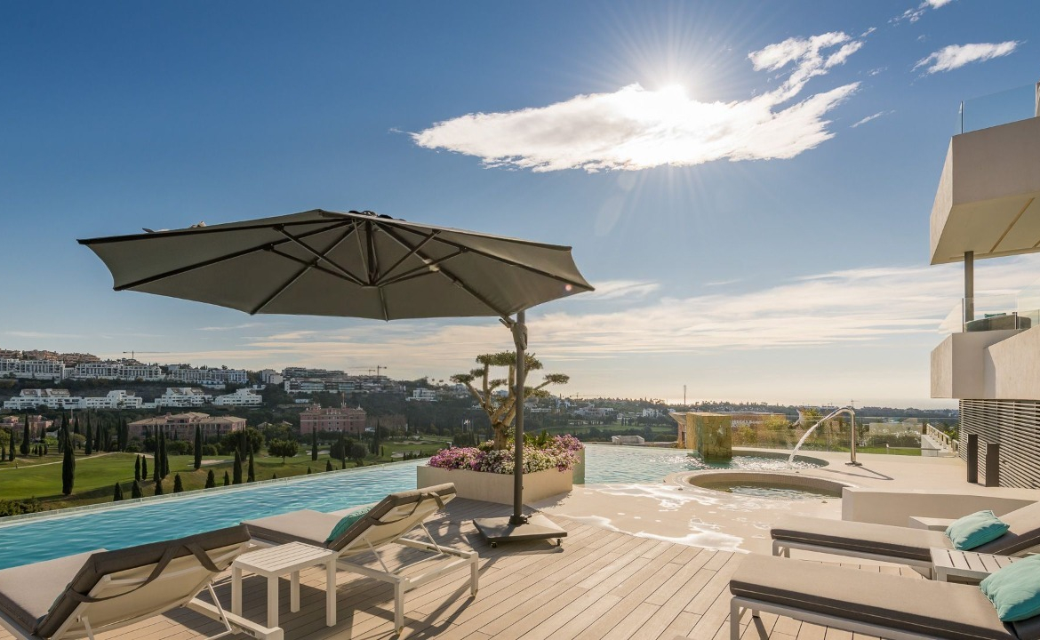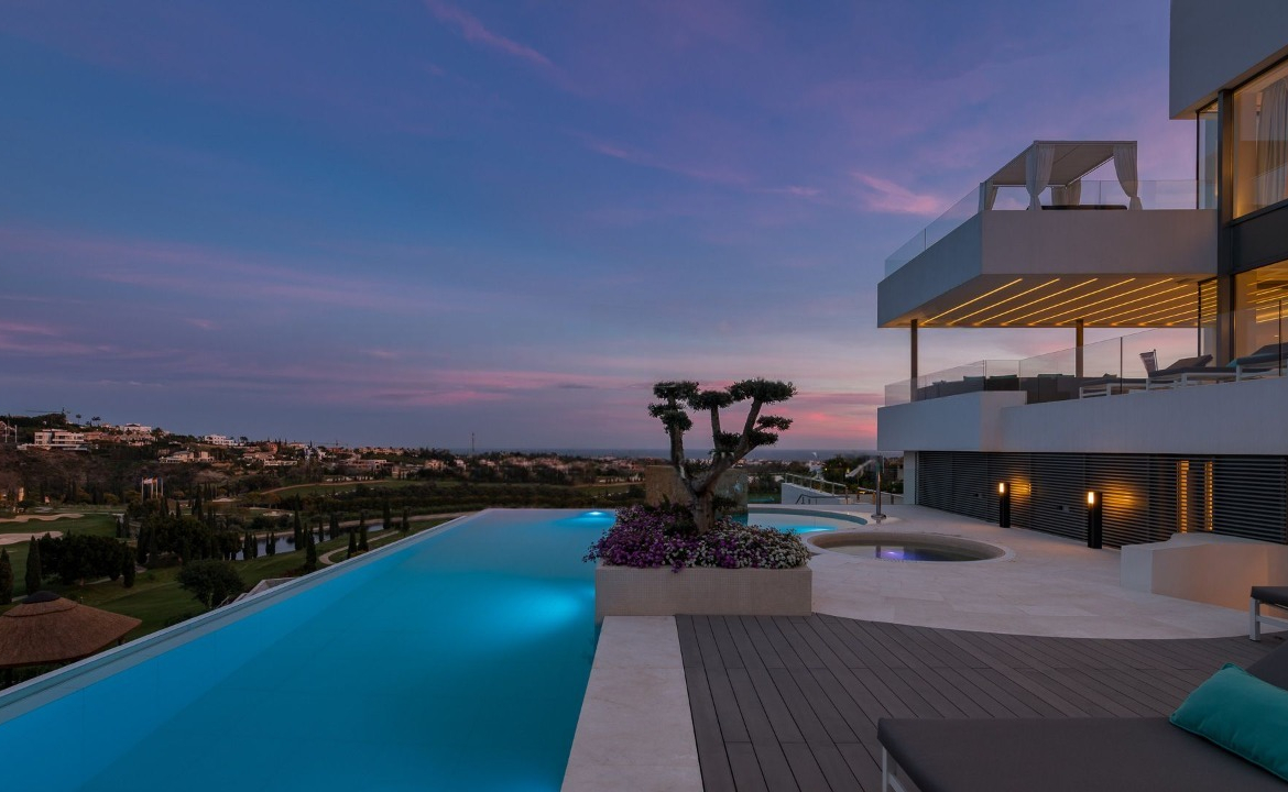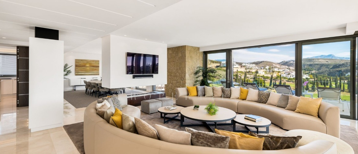 Main level of the property consists of a vast living room, a modern fully equipped kitchen, an open space dining area and an office, all with a direct access to the covered terrace with al fresco dining area, lounge area, facing breathtaking views of the Mediterranean Sea, mountains, golf courses and Anantara Villa Padierna Palace.