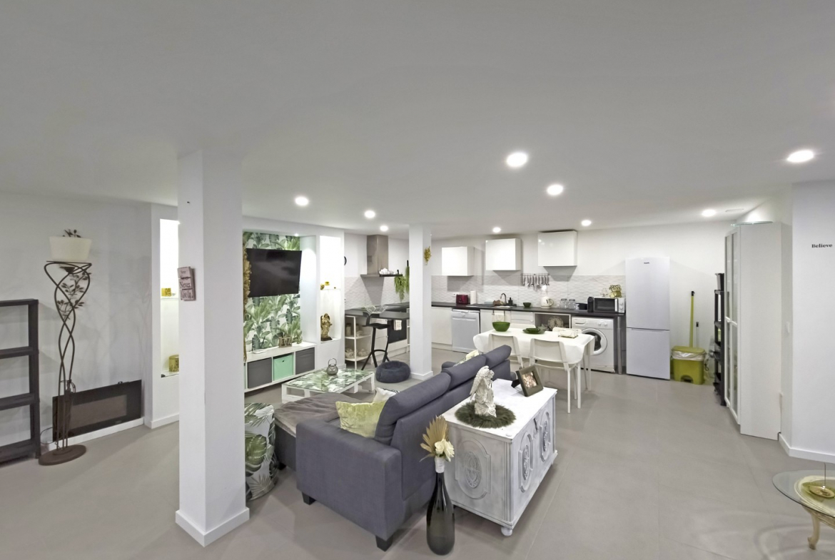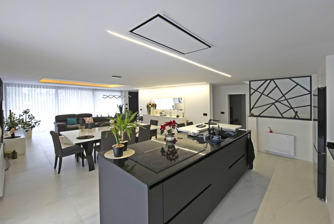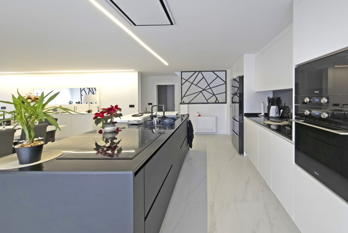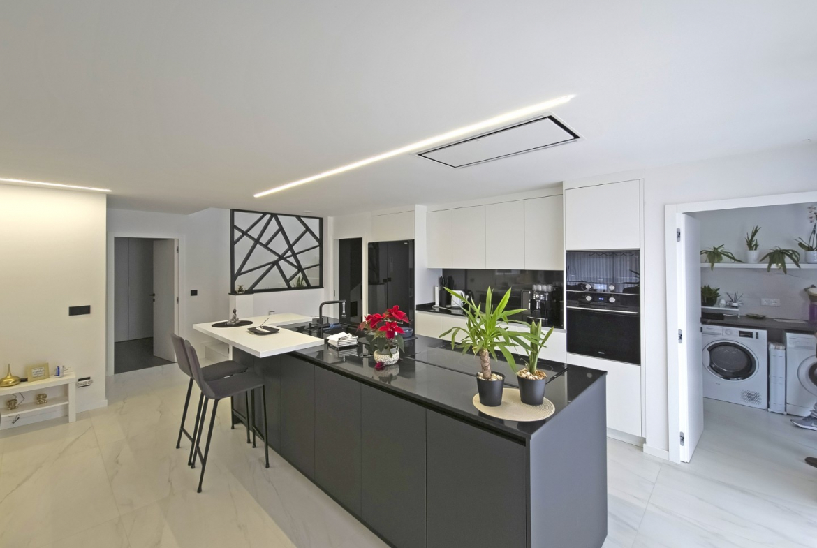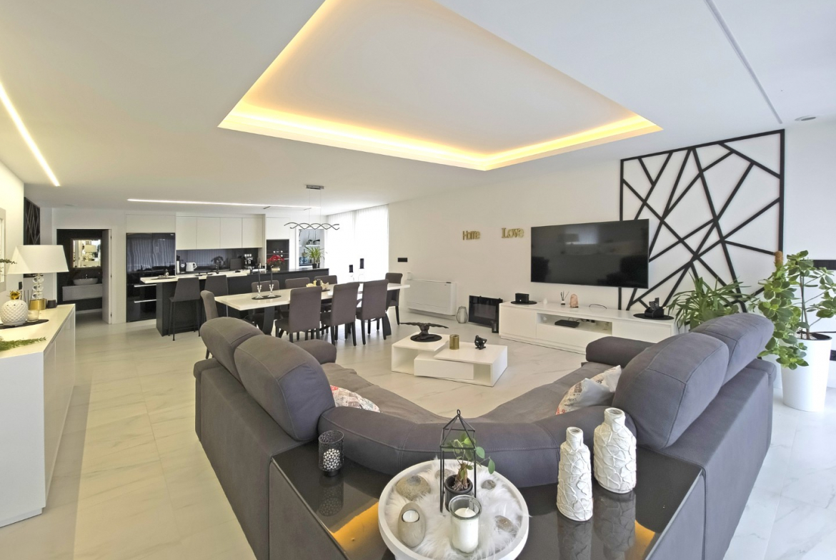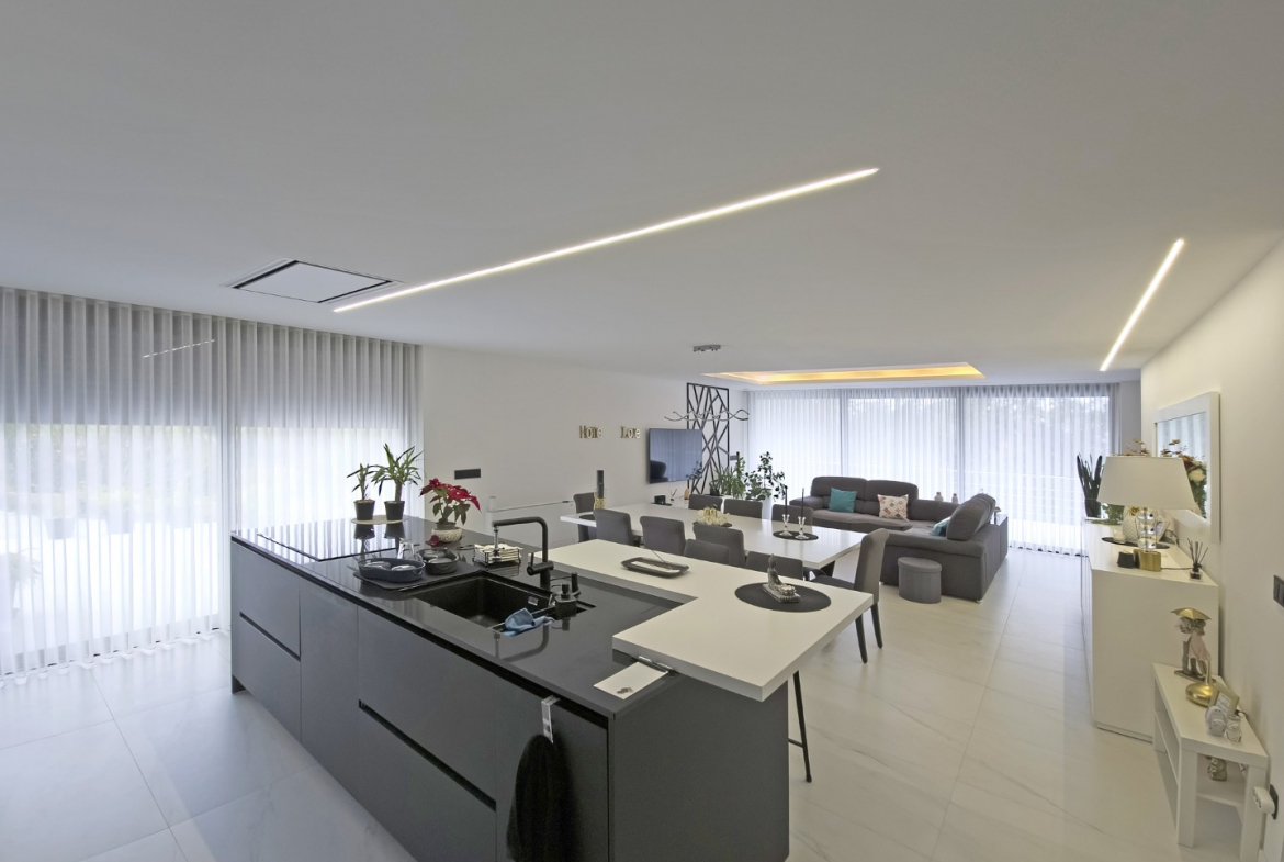 Upon entering, the villa reveals a welcoming and light-filled interior. The main living area follows an open-plan concept that seamlessly connects the living room and the fully equipped modern kitchen. Consequently, the space feels expansive, practical, and ideal for daily living. In addition, large glazed surfaces invite abundant natural light, creating a warm and comfortable environment.