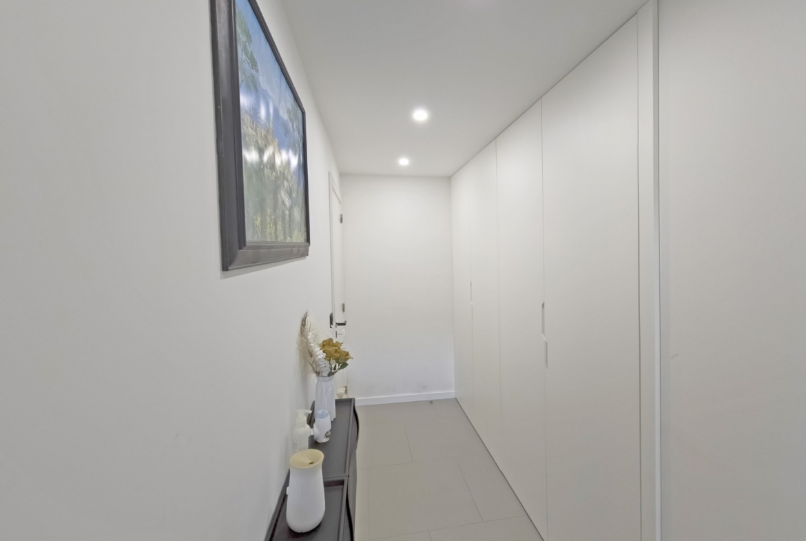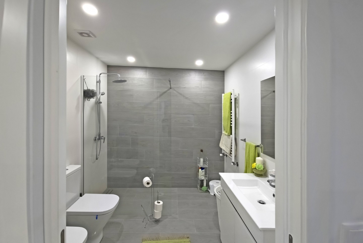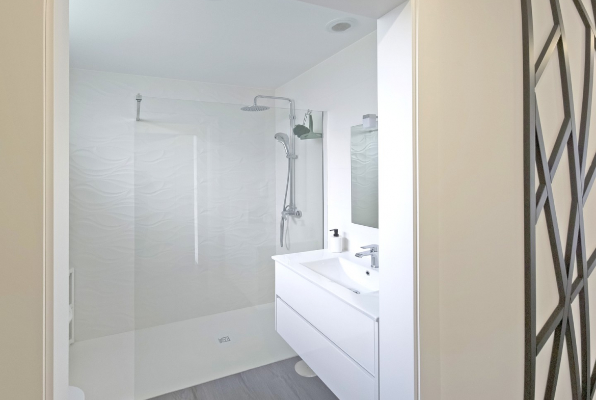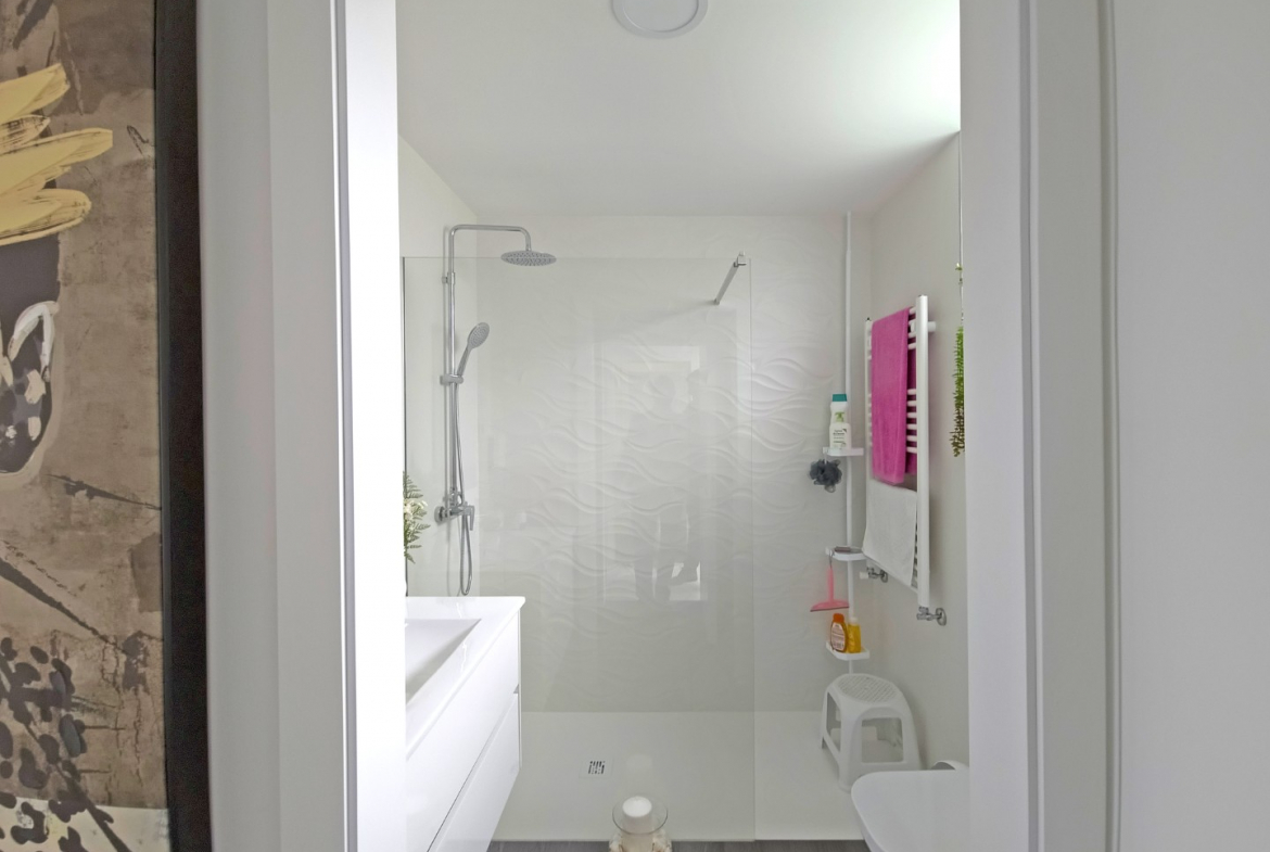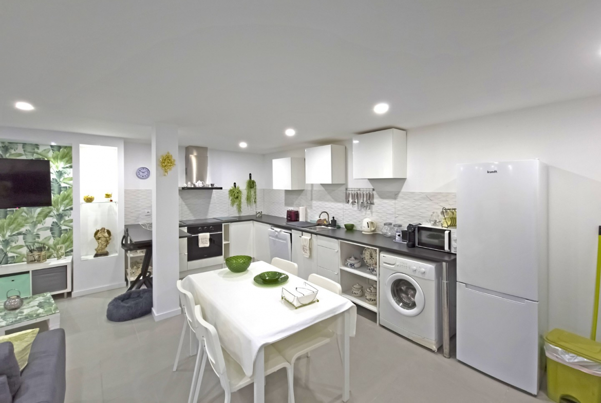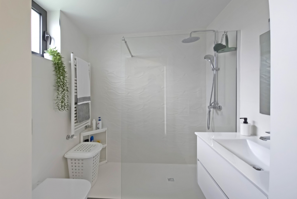 Upon entering, the villa reveals a welcoming and light-filled interior. The main living area follows an open-plan concept that seamlessly connects the living room and the fully equipped modern kitchen. Consequently, the space feels expansive, practical, and ideal for daily living. In addition, large glazed surfaces invite abundant natural light, creating a warm and comfortable environment.