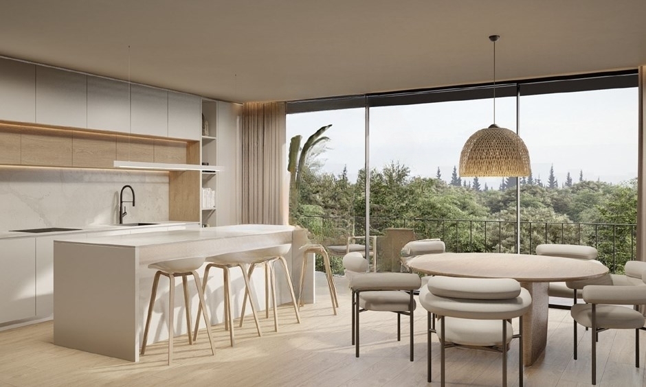 The open-plan kitchen includes a central island and comes fully equipped with Bosch appliances, a Cata extractor, and a Beko side-by-side refrigerator. In addition, this level includes a guest WC and a garage for two vehicles.