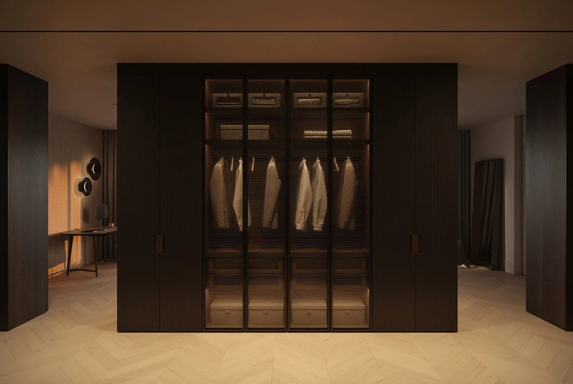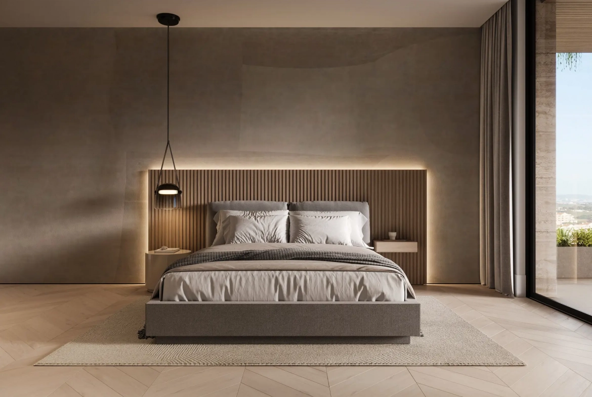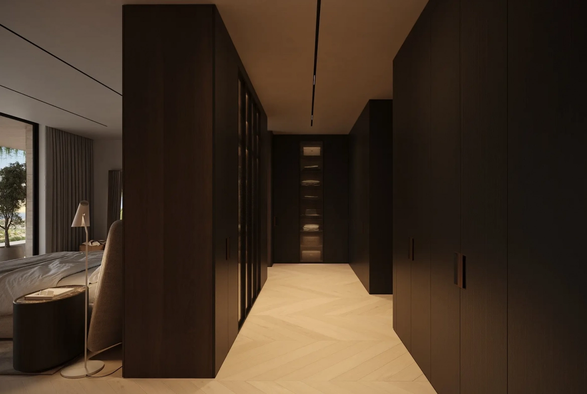 This five-bedroom, five-bathroom villa has been designed to maximise space, comfort, and natural light. Upon entering, open-plan living areas immediately define the home’s contemporary character. Floor-to-ceiling glass doors connect the interiors with the terraces. Consequently, the villa enjoys abundant daylight and uninterrupted views.