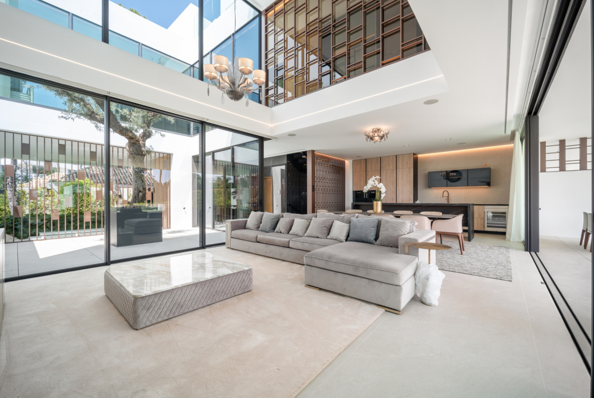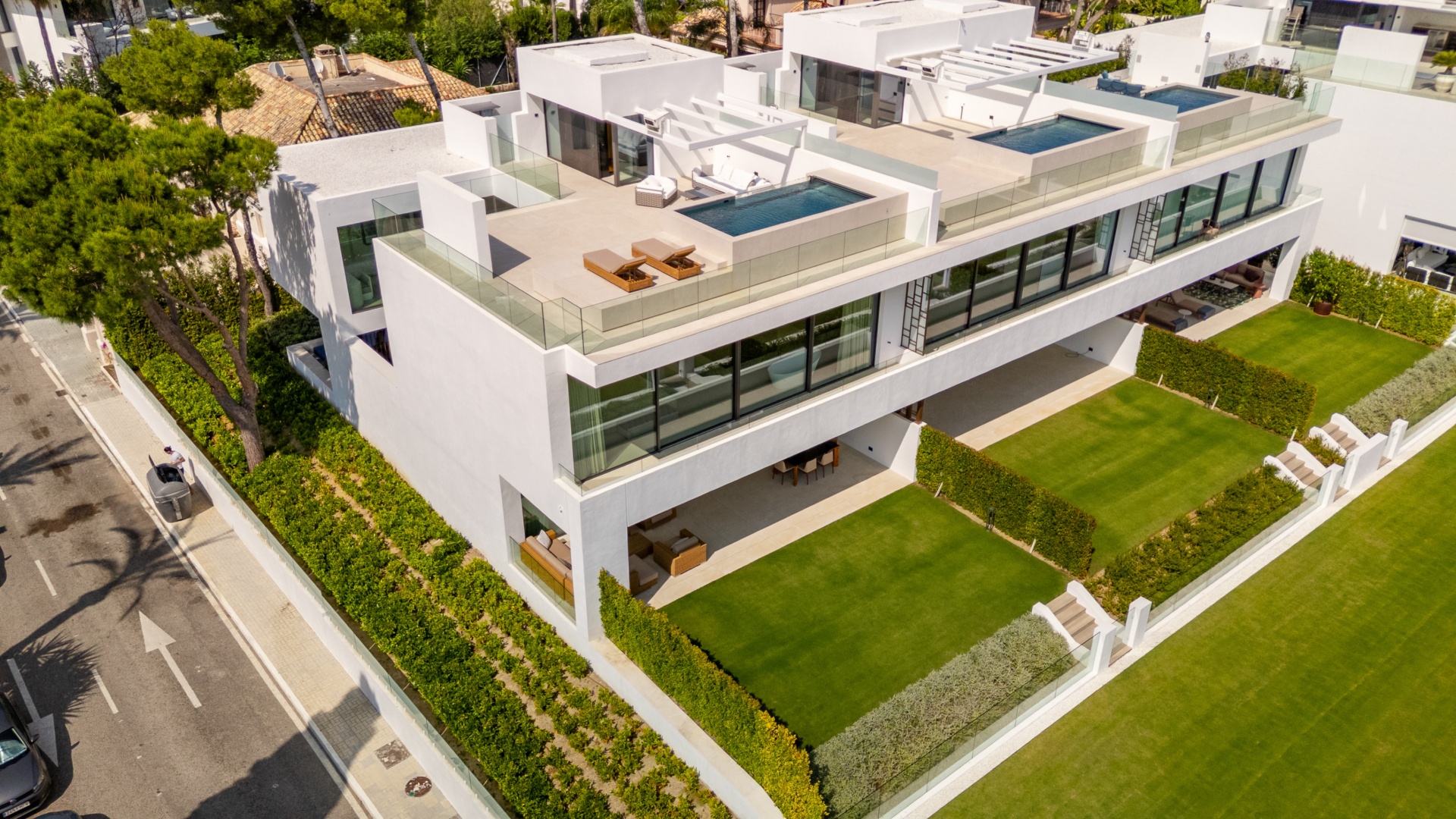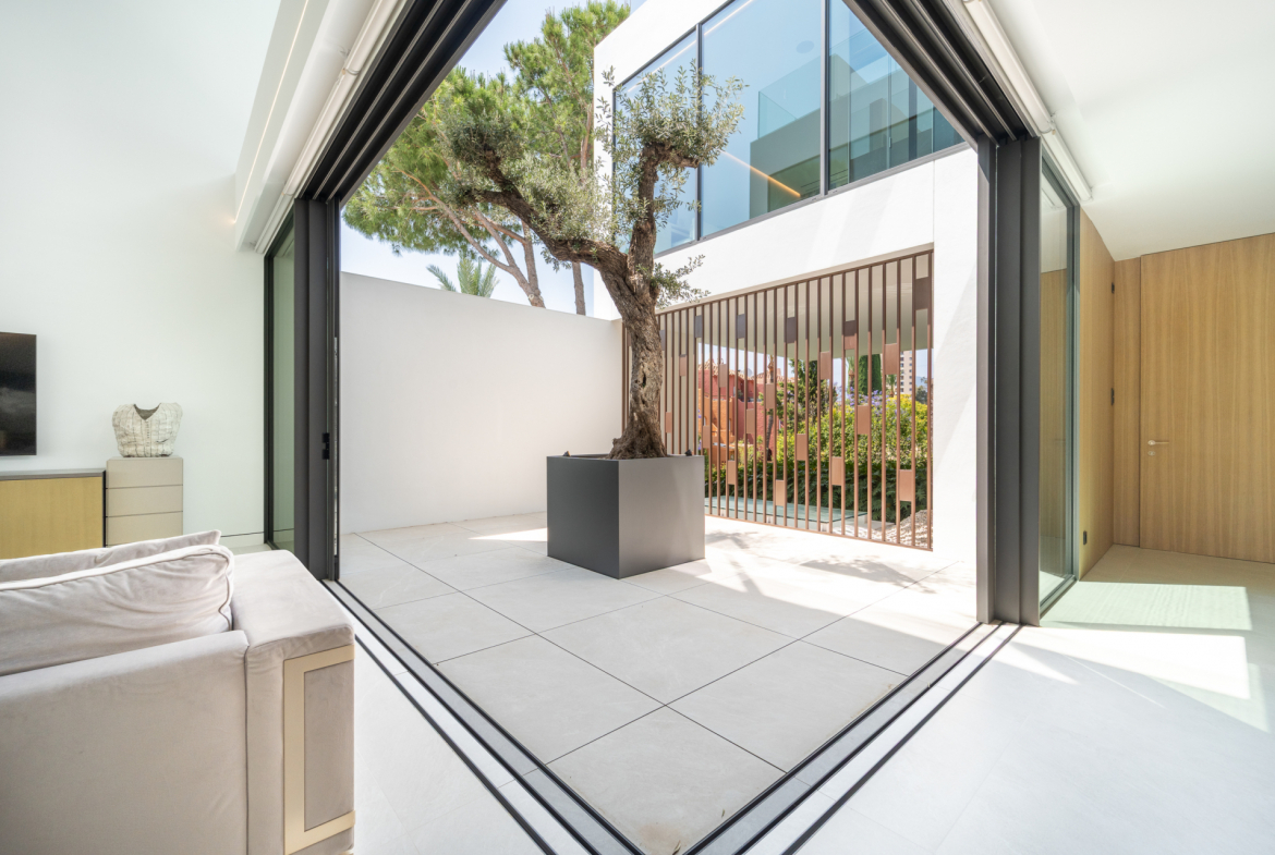 Completed in December 2023, the villa offers 606 m² of built area on a private plot of 92 m², with 230 m² of terraces. Distributed over four floors connected by a private staircase, the home is designed for seamless indoor-outdoor living. Facing south, it enjoys panoramic views of the Mediterranean, La Concha mountain, and Puerto Banús.