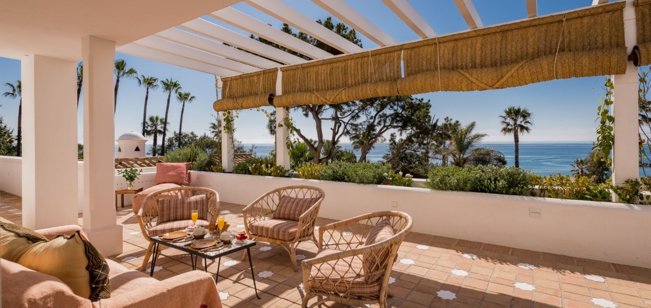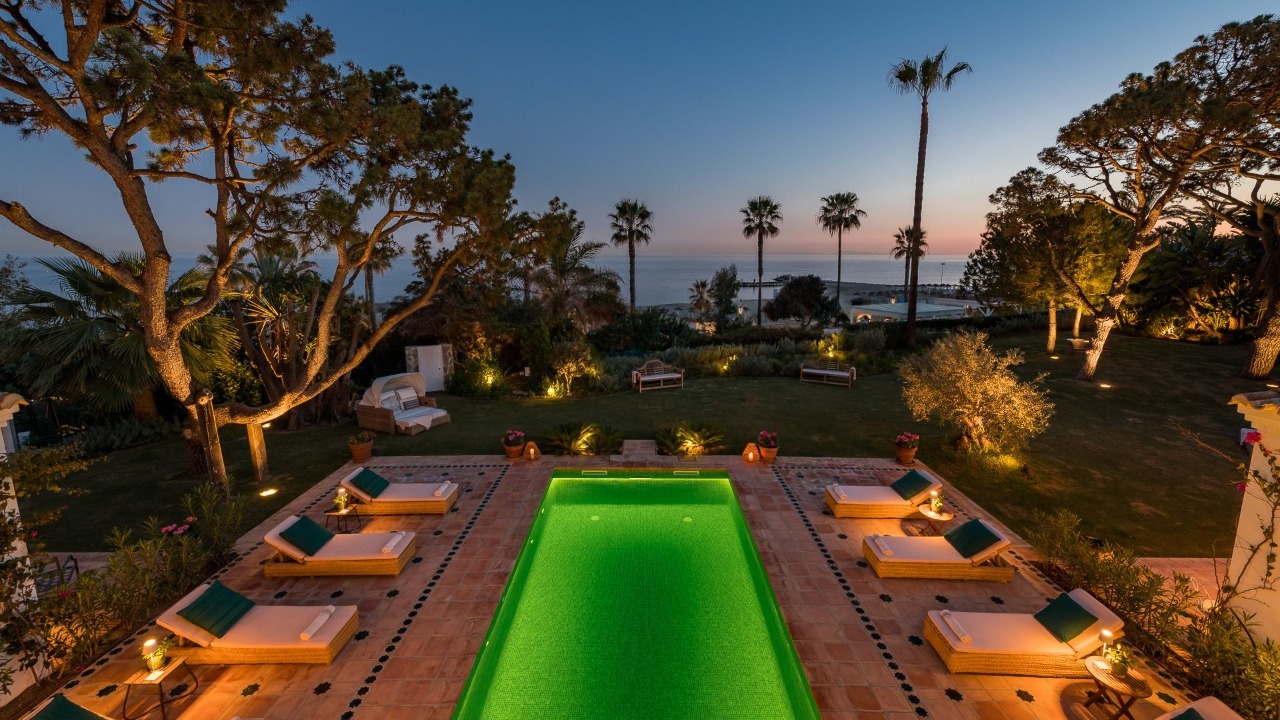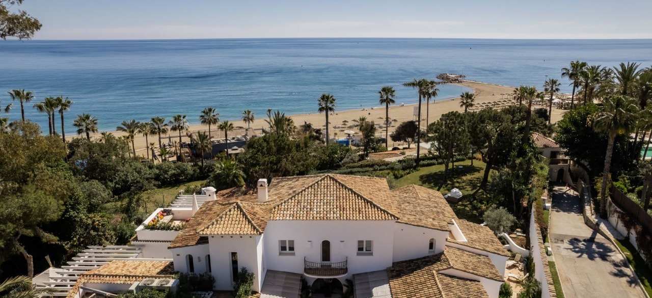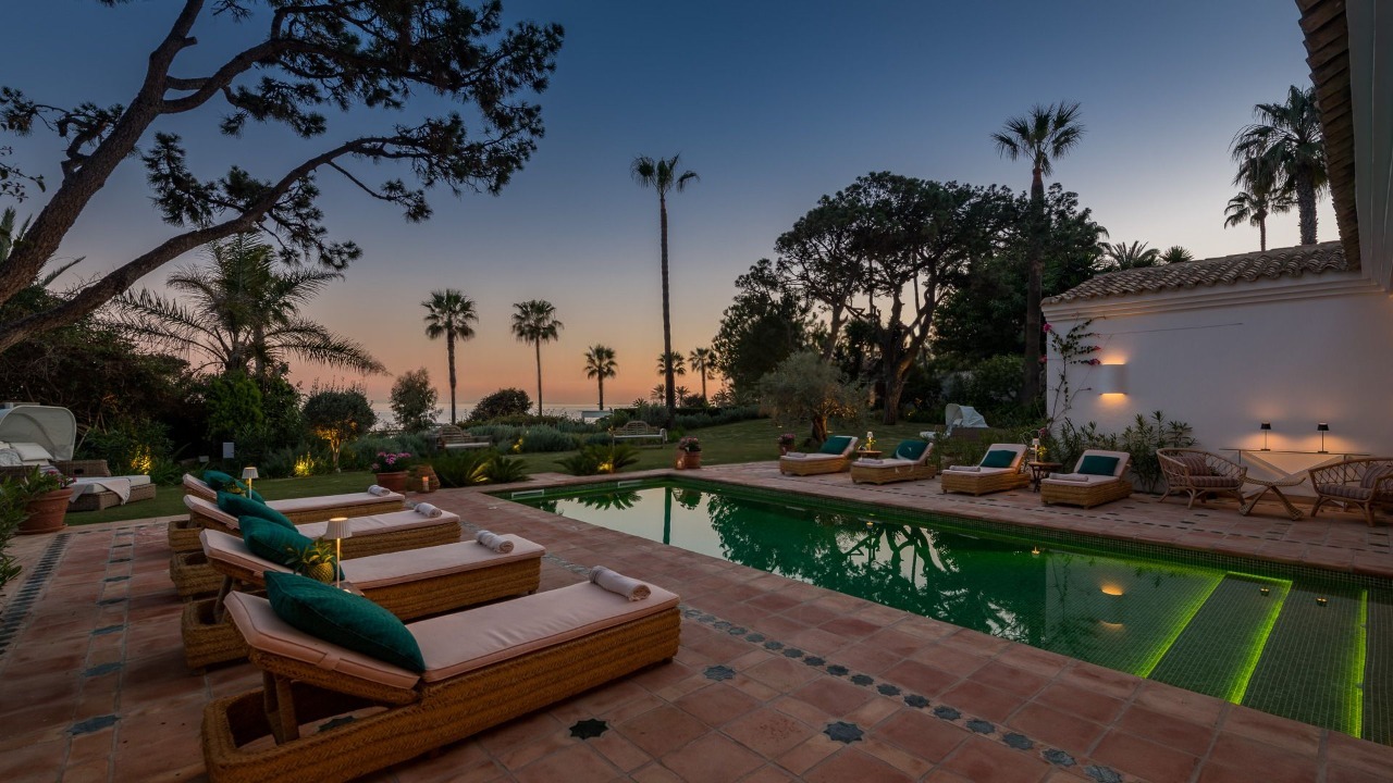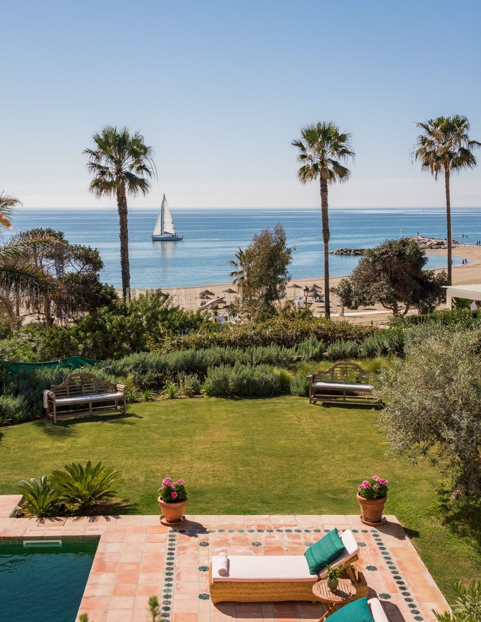 Indulge in luxury villa holidays at Villa Auréline, an exclusive beachfront villa ideally located in the prestigious Los Verdiales, within walking distance to Marbella’s renowned Puente Romano and Marbella Club hotels. This stunning, recently renovated villa offers breathtaking panoramic sea and mountain views, setting the scene for an unforgettable Marbella vacation.