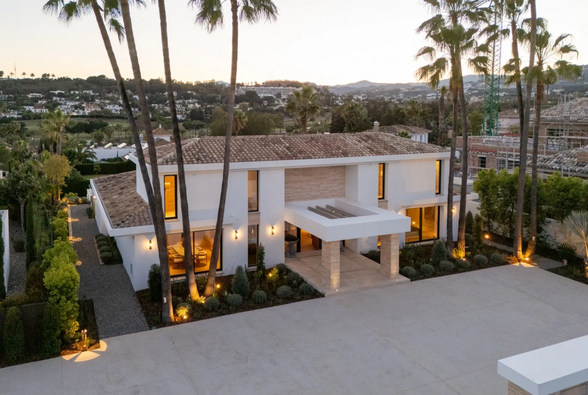 Nestled within the prestigious Aloha enclave of Nueva Andalucía, this exceptional contemporary villa presents a refined fusion of modern design and natural architectural elements. The residence immediately captivates with its striking symmetry, clean lines, and the elegant integration of organic textures. Moreover, lush landscaping frames the entrance, while traditional roof tiles subtly reference the region’s architectural heritage. Consequently, the property offers a distinctive balance between contemporary aesthetics and timeless Mediterranean character.