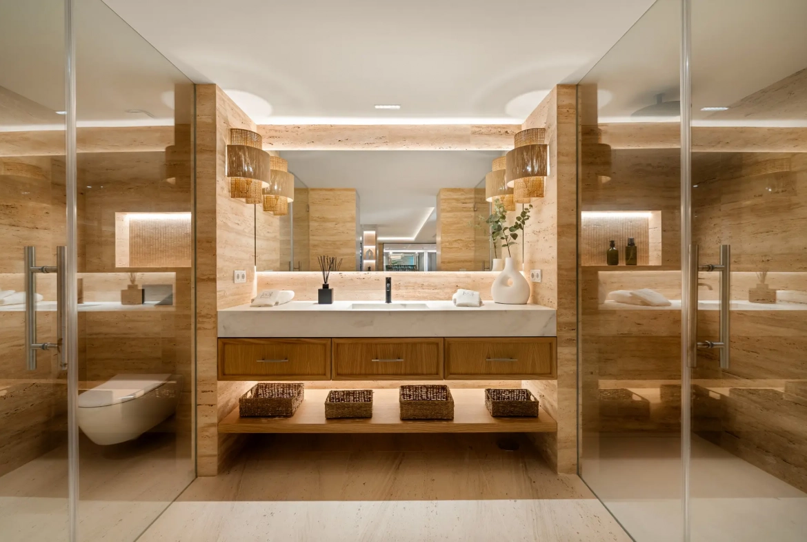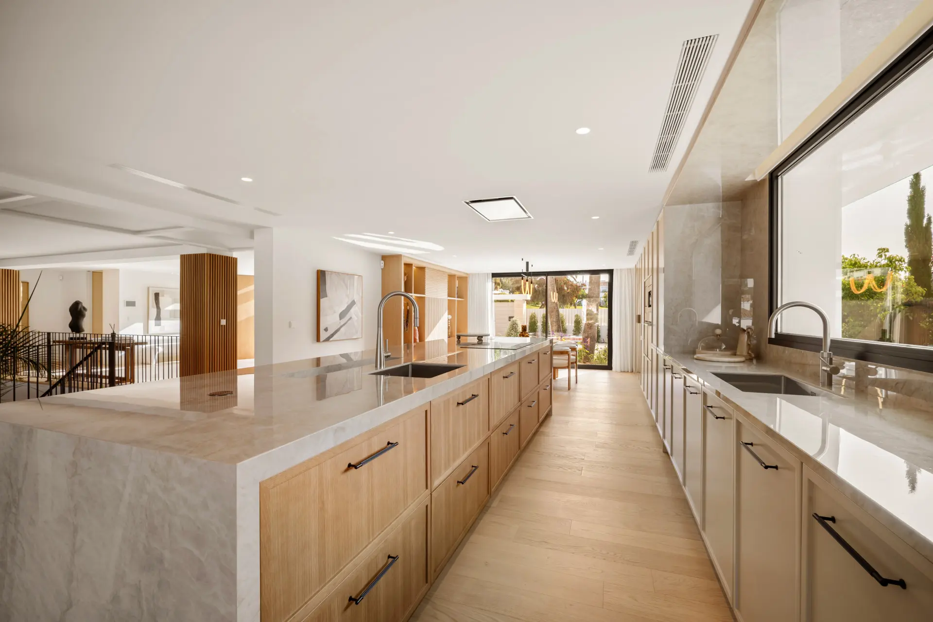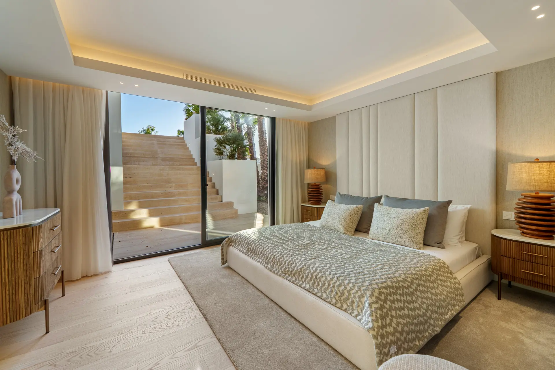 The villa offers five generously proportioned bedrooms, each designed with comfort and privacy in mind. Additionally, the residence enjoys unobstructed views across the renowned golf course, a defining characteristic of the Aloha area. Therefore, the property benefits from a remarkable visual setting that enhances its exclusivity.