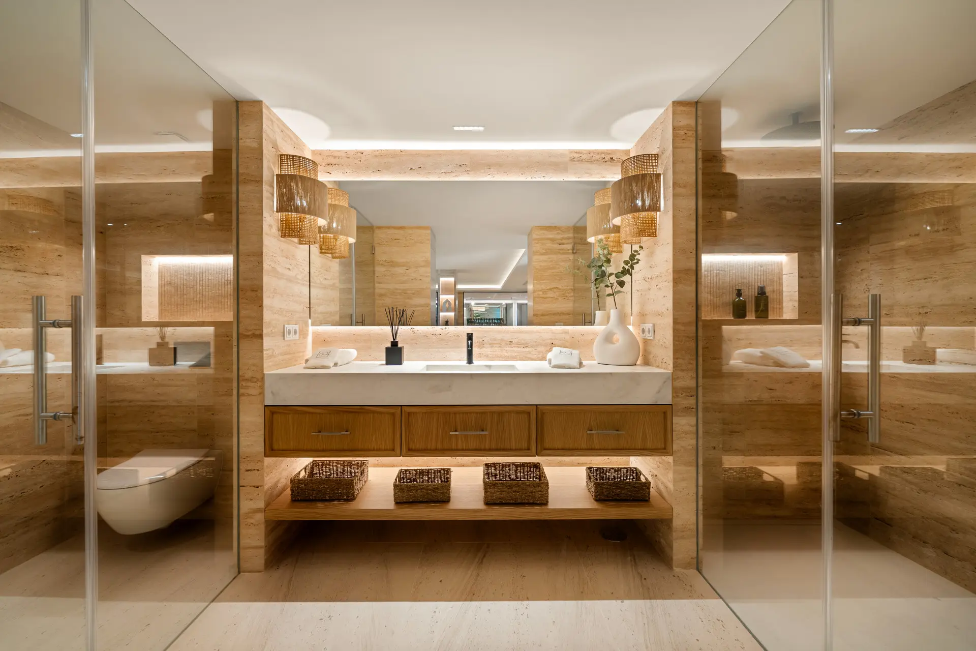 Inside, the villa reveals a calm and inviting interior environment defined by a soft neutral palette and carefully selected natural materials. Warm wooden accents introduce texture and depth, most notably through distinctive ribbed paneling that characterizes the living and kitchen areas. As a result, the interiors convey understated refinement while maintaining a welcoming residential atmosphere.