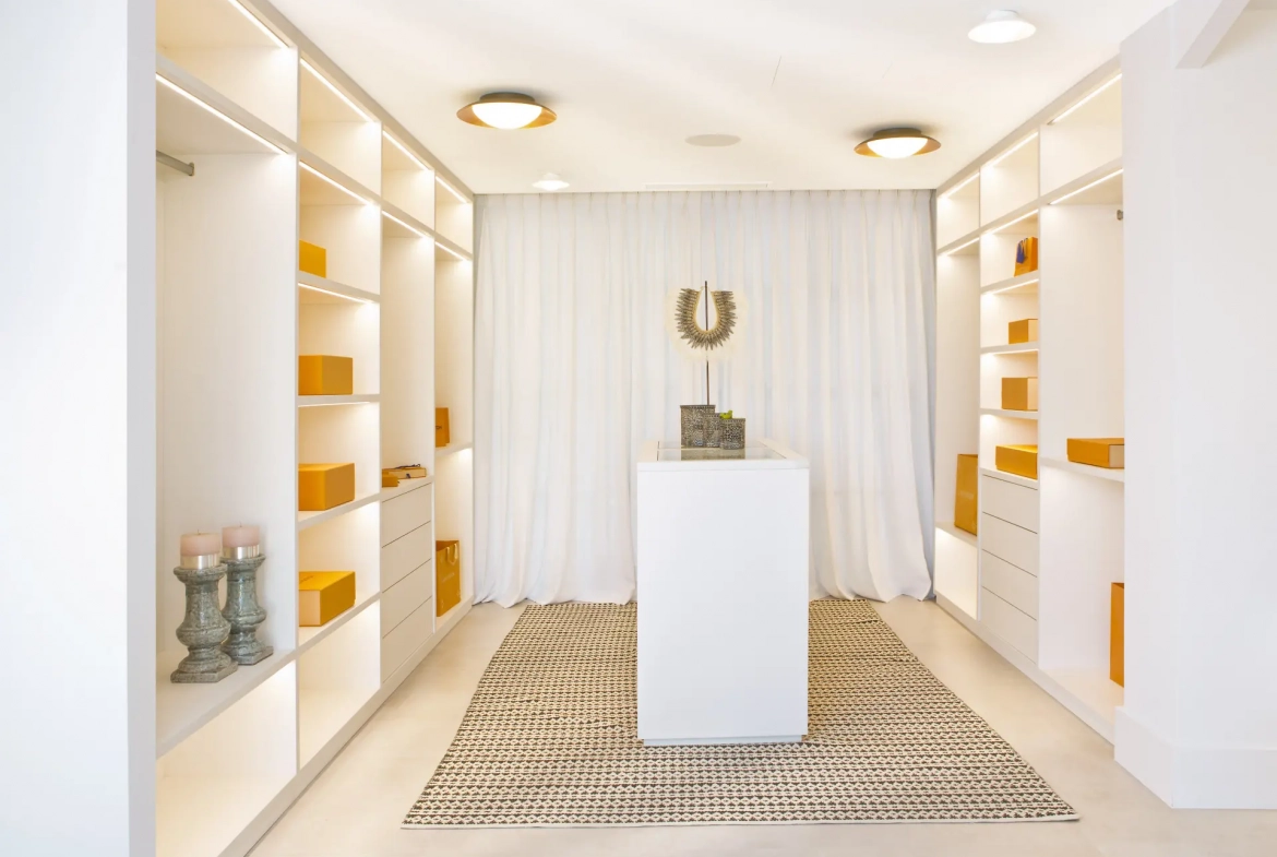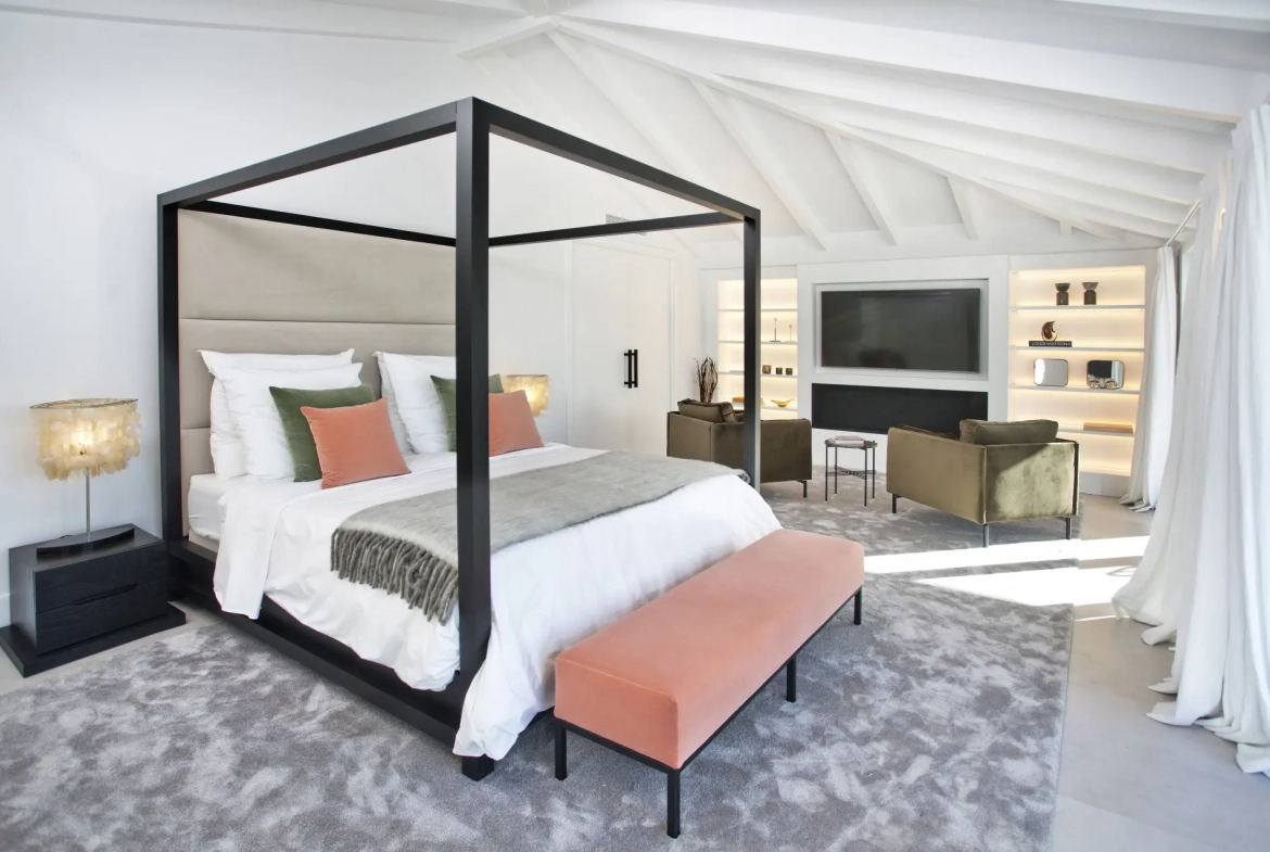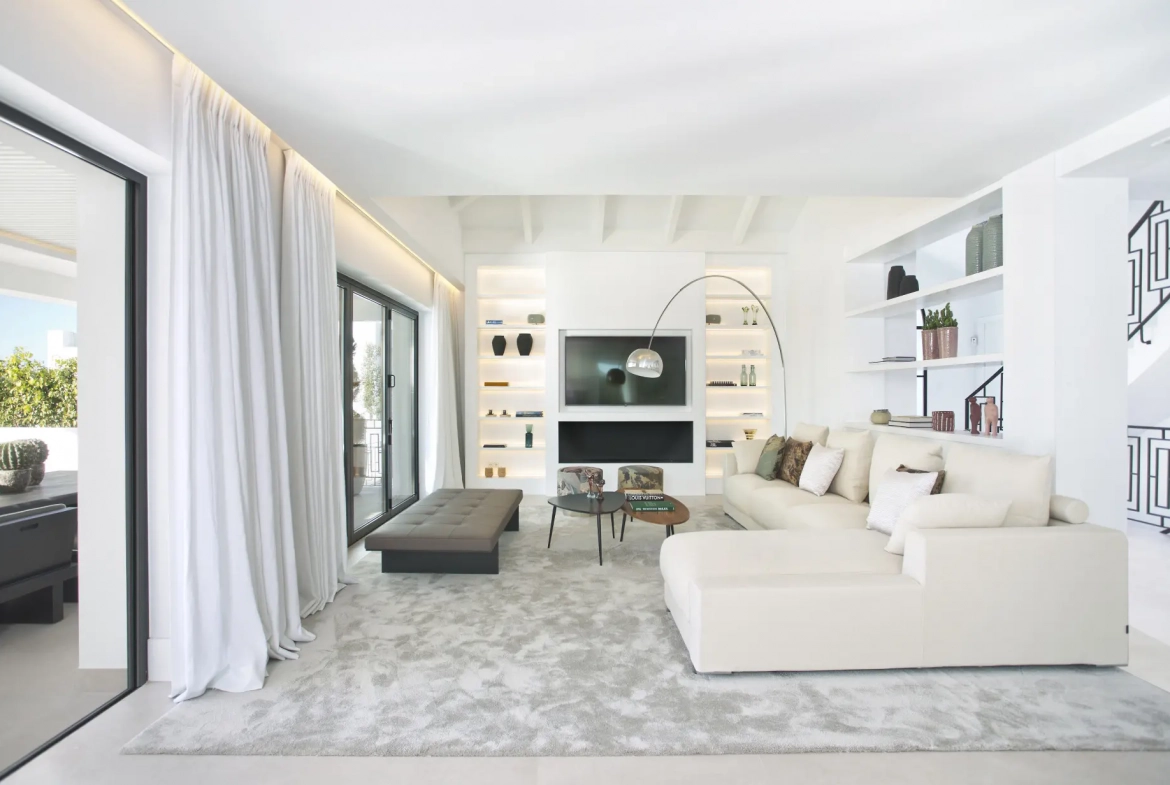 Built-in shelving and a TV wall define the living area. Large black-framed windows enhance natural light and connect the interior with the exterior. White-painted wooden ceilings add warmth, while iron balustrades introduce a refined architectural detail.
