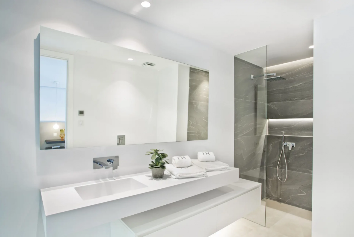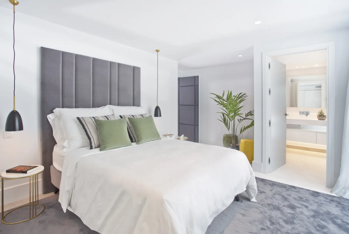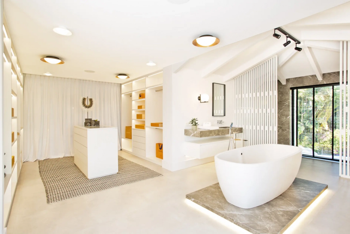 Upstairs, the master suite offers privacy and comfort. It includes a walk-in wardrobe and a spacious bathroom with double sinks. A freestanding bathtub and separate shower complete the design.