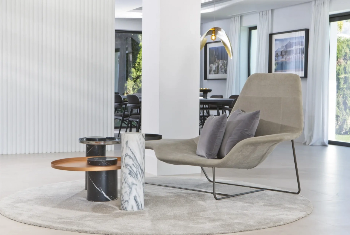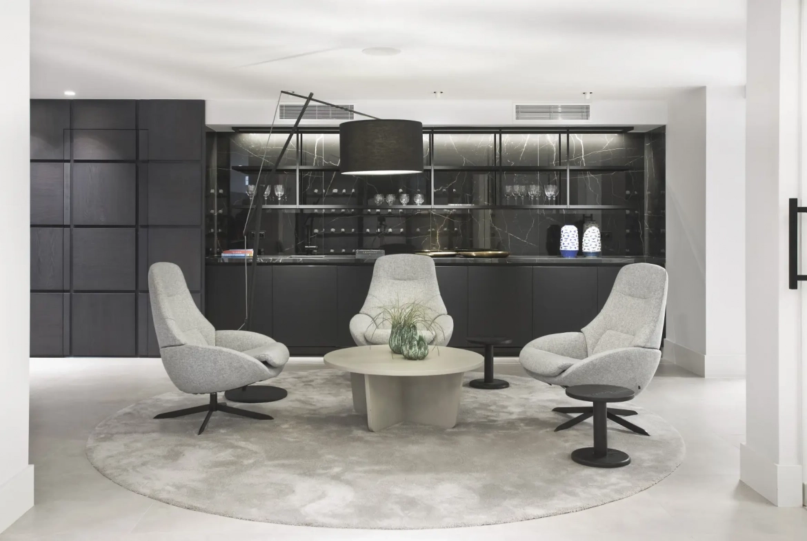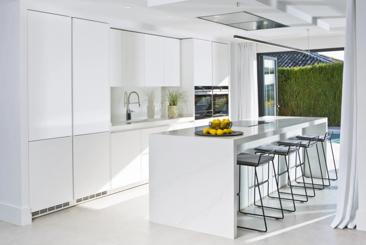 The villa is distributed across three levels. The main floor features a bright open-plan layout designed for modern living. The kitchen includes a central island and Siemens appliances. It connects seamlessly to the dining area and the spacious L-shaped living room.