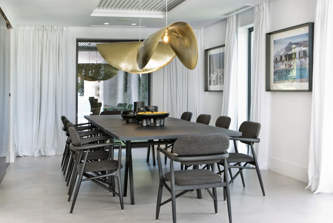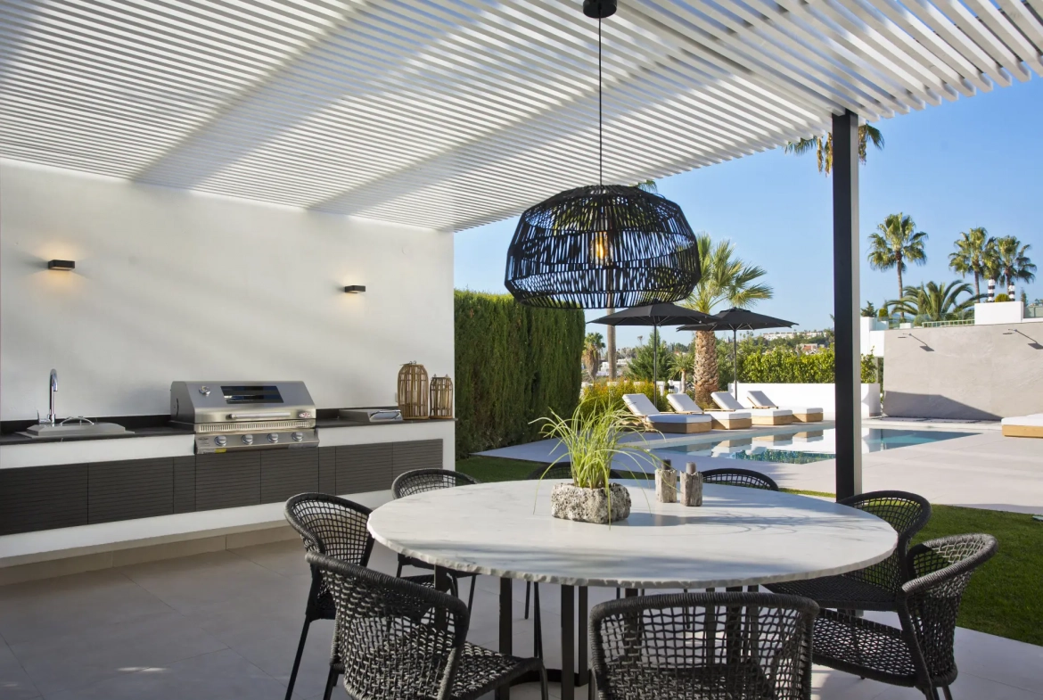The living area opens directly onto a covered terrace and private swimming pool. The transition between indoor and outdoor spaces feels natural and fluid. The landscaped garden also features a shaded outdoor kitchen and dining area. This space is ideal for entertaining and relaxed gatherings.