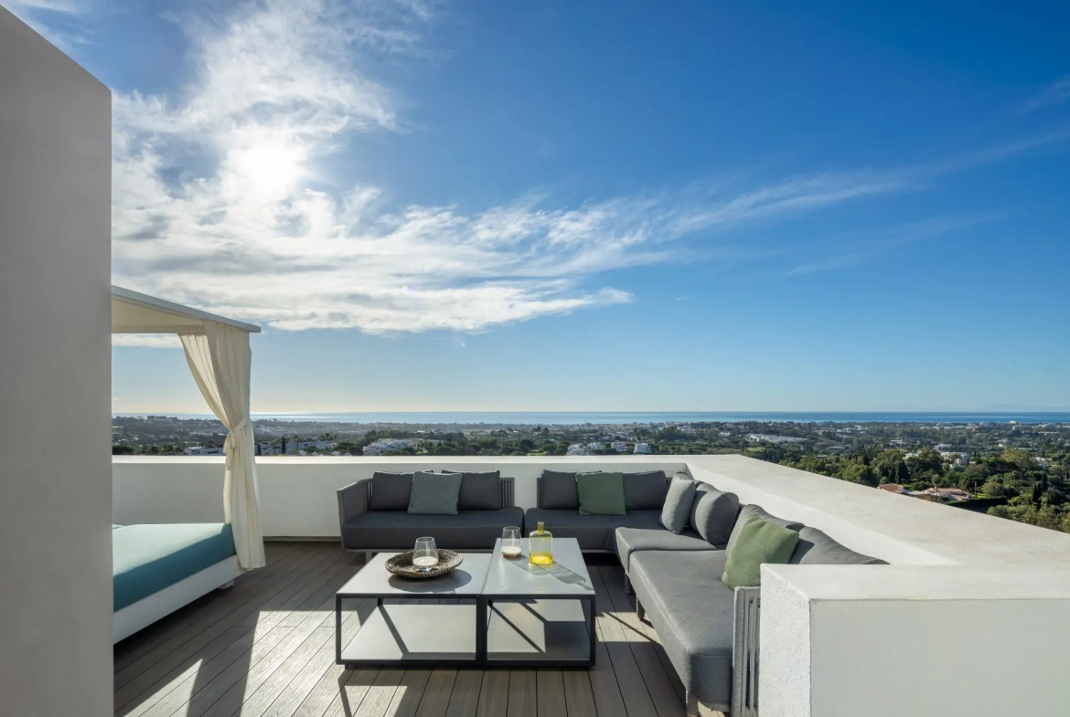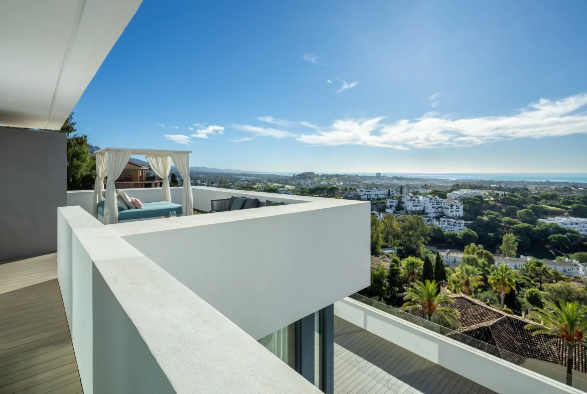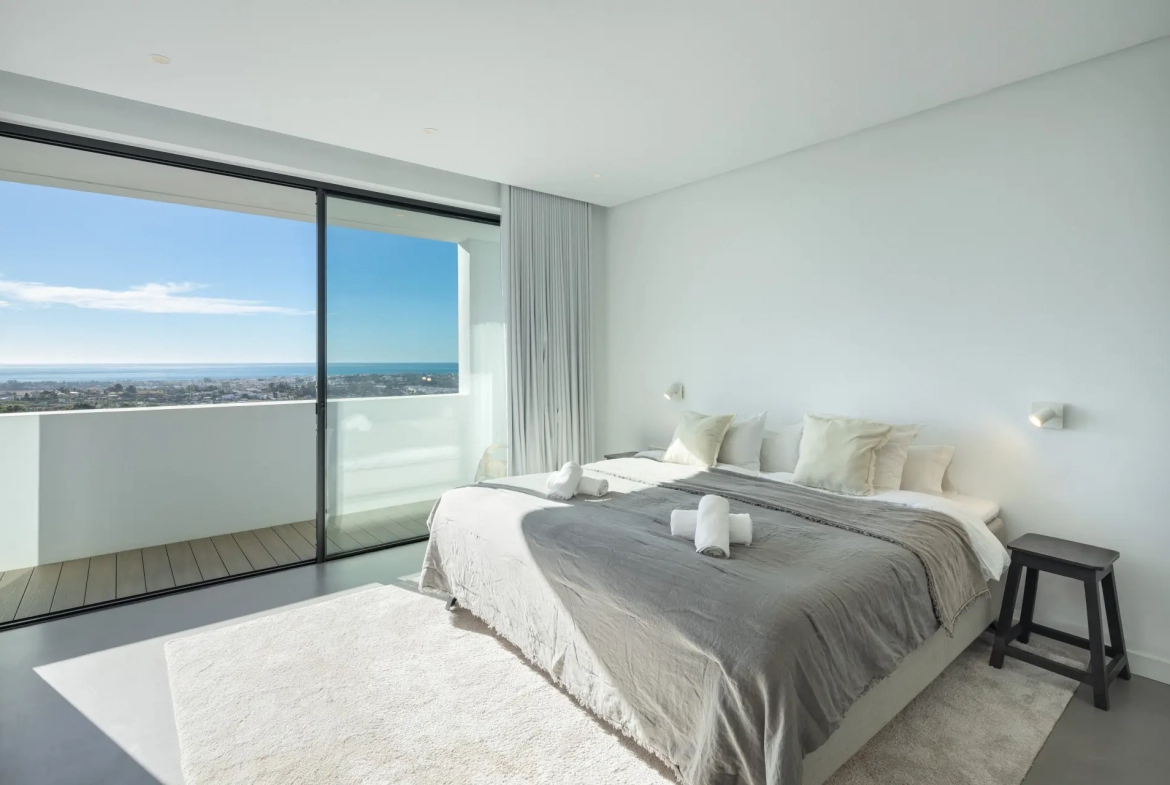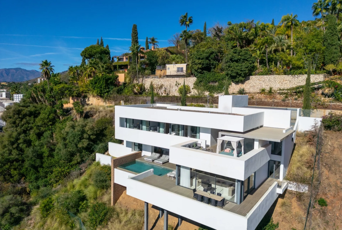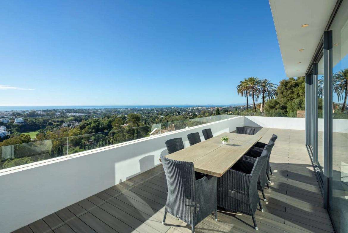 Situated within the secure gated community of El Herrojo Alto in La Quinta, this contemporary villa enjoys a privileged elevated position with panoramic views across the Mediterranean coastline. From every level of the residence, the property captures uninterrupted sea views extending towards Gibraltar and the North African horizon. Consequently, the villa offers a rare combination of privacy, scenery, and modern living within one of Benahavís’ most desirable residential enclaves.