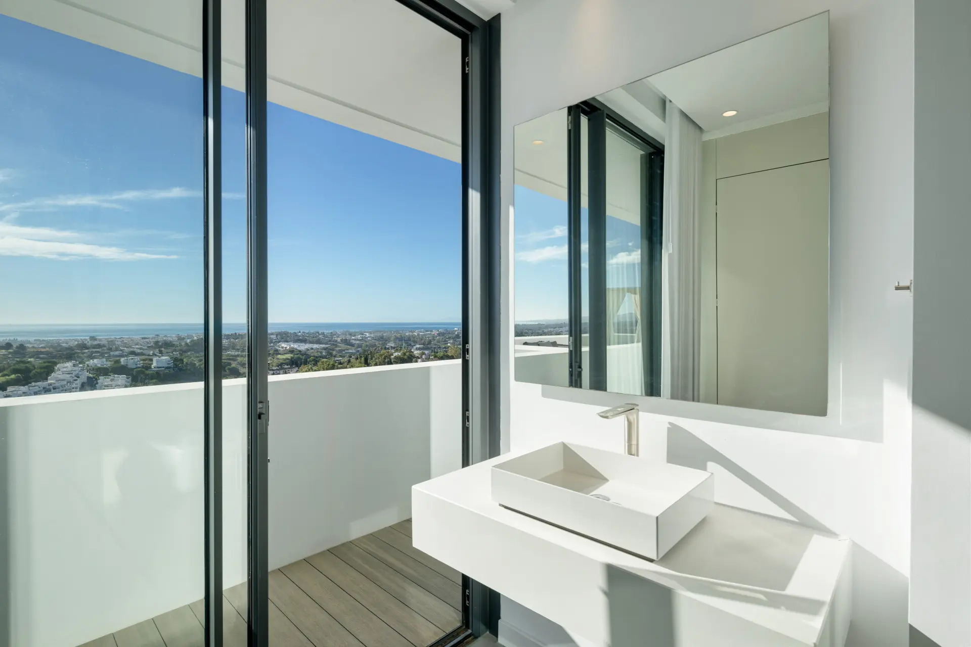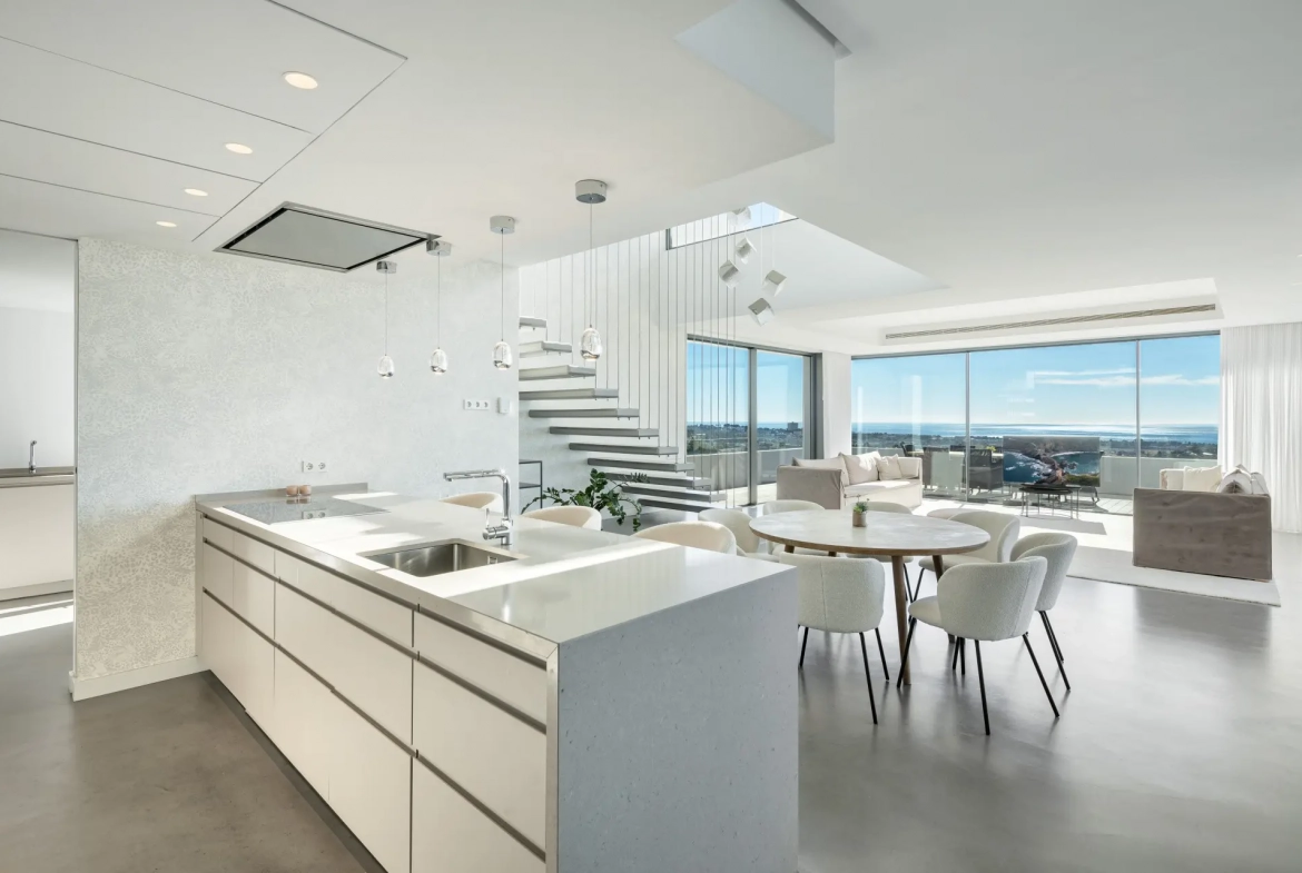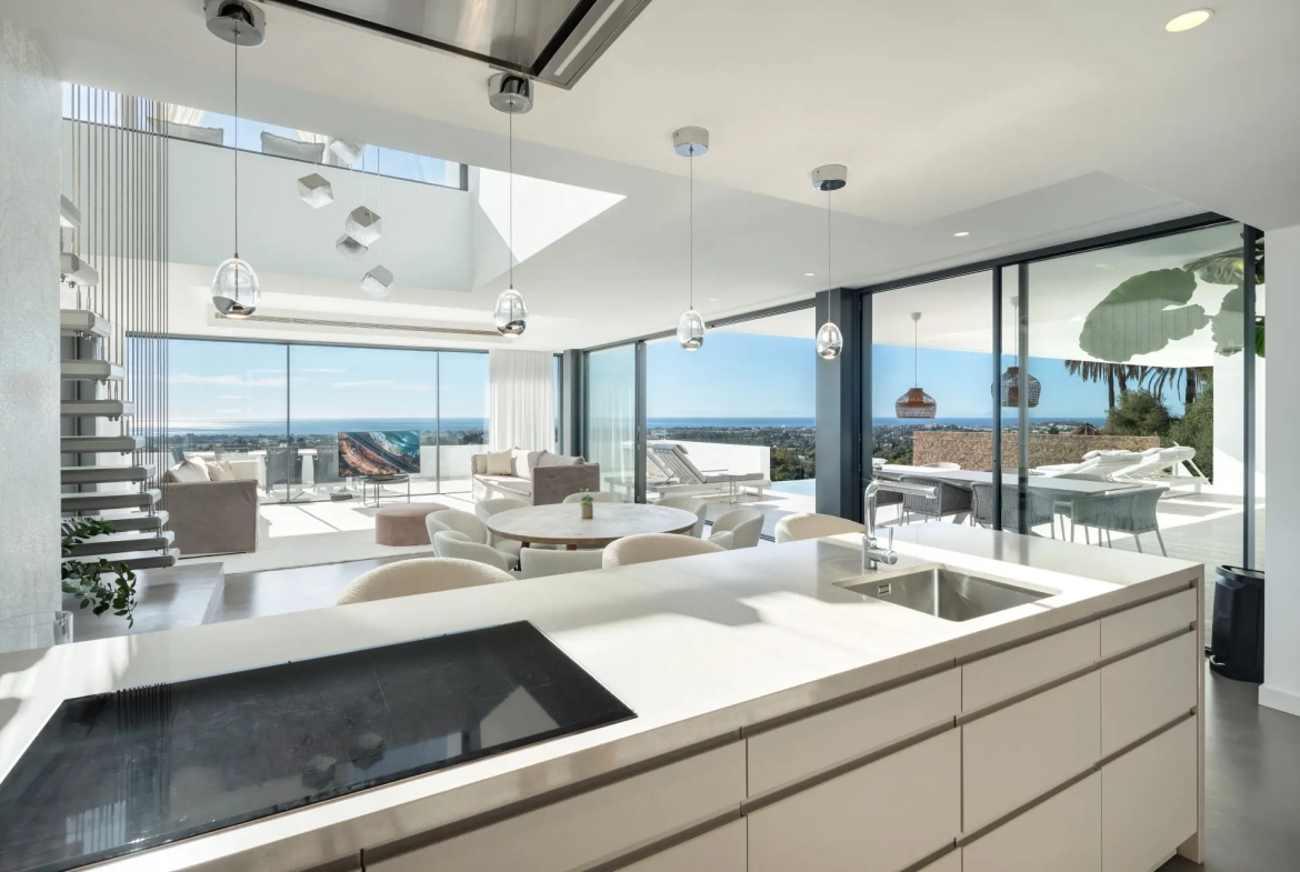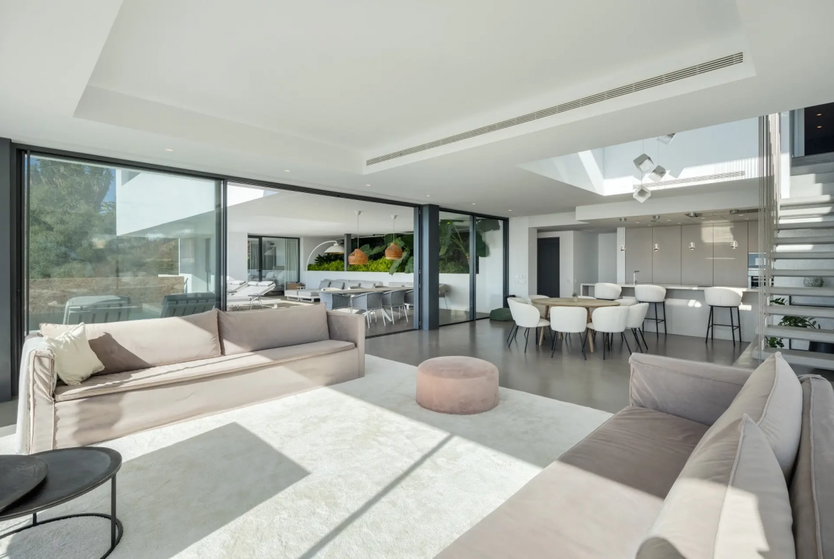 The villa’s interior architecture reflects a clean and modern design language, centred around an elegant open-plan layout. The main living areas integrate seamlessly, thereby creating a bright and fluid environment enhanced by natural light. Expansive floor-to-ceiling glass sliding doors establish a direct connection with the terraces, reinforcing the indoor–outdoor lifestyle associated with Marbella living.