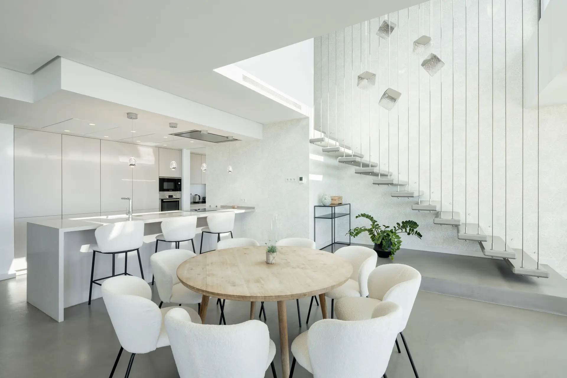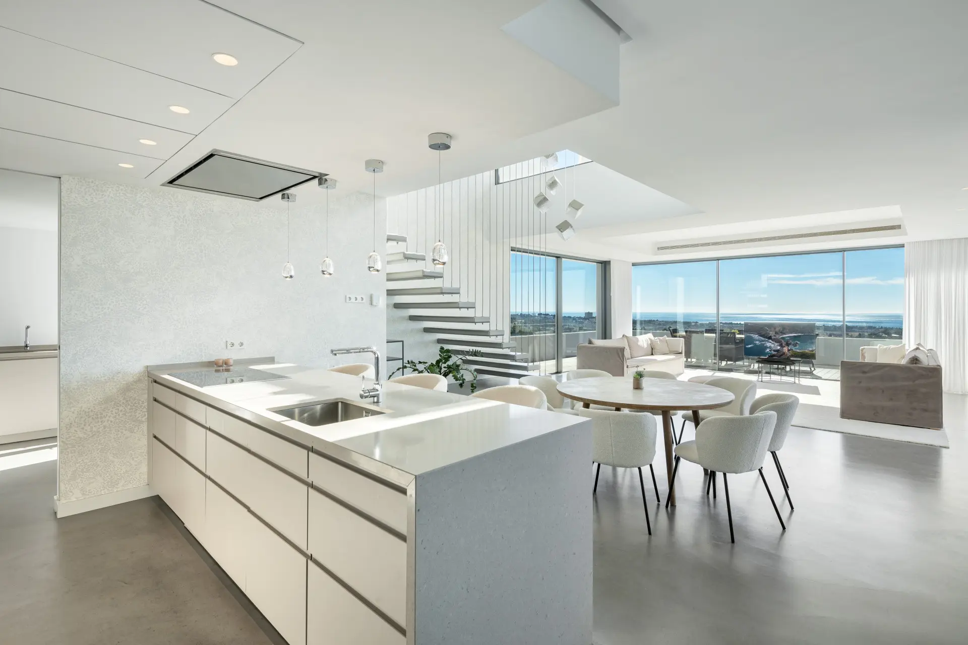 The modern kitchen has been designed for both functionality and visual impact. Equipped with premium appliances and generous storage, it forms a central element of the living space while maintaining unobstructed views of the surrounding landscape.