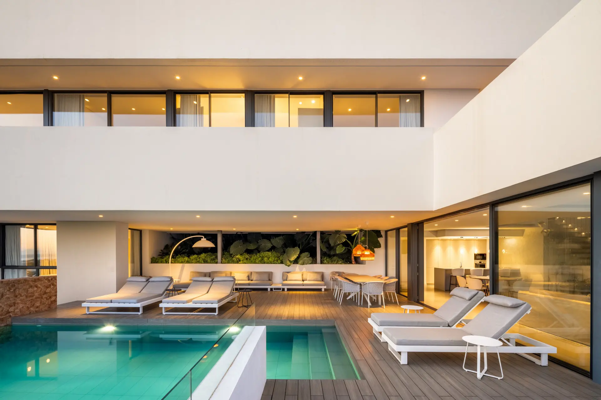 The exterior spaces have been carefully arranged to maximise comfort and enjoyment throughout the year. A spacious terrace accommodates a private swimming pool designed for year-round use, alongside dedicated chill-out zones and an al fresco dining area. Therefore, the villa provides an ideal environment for relaxation, entertaining, and enjoying the exceptional views.