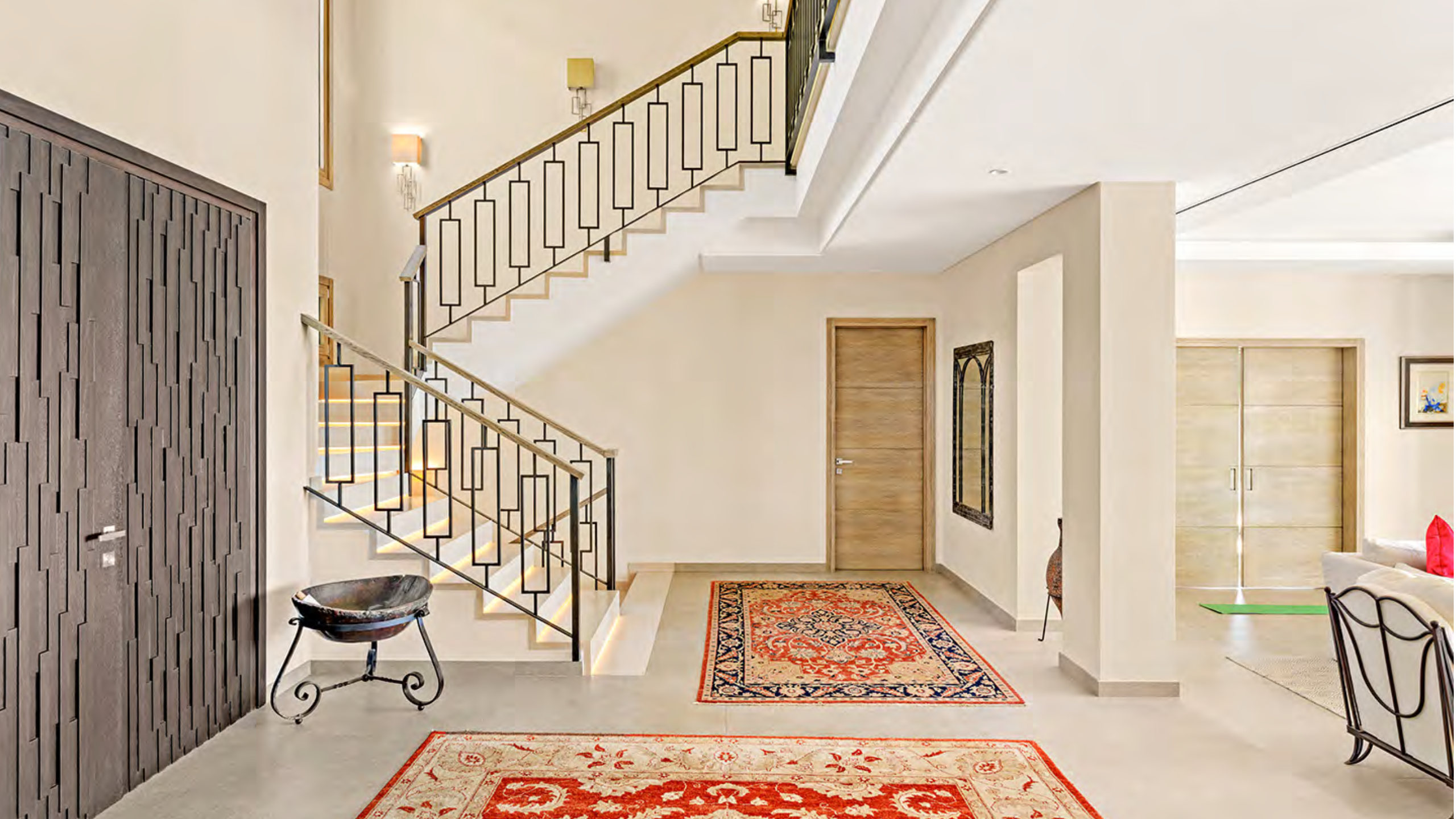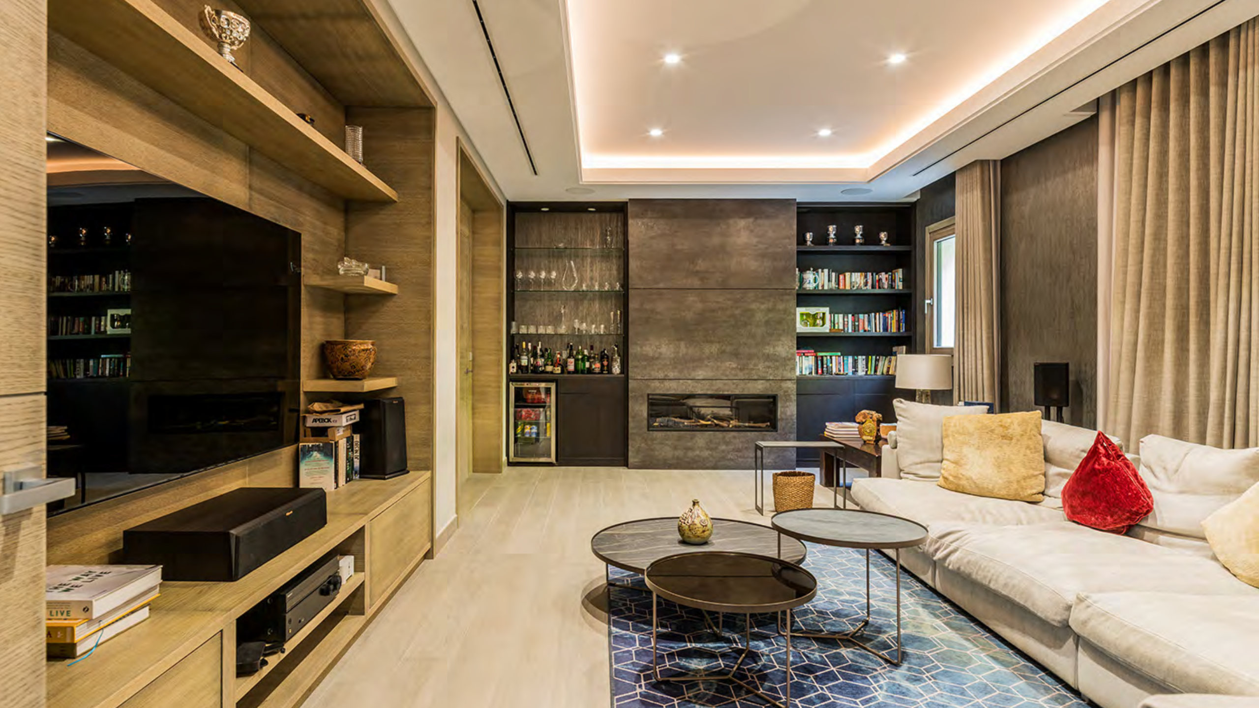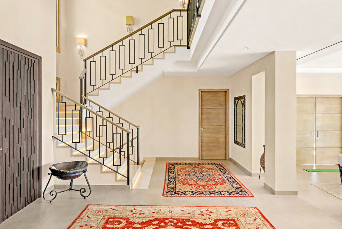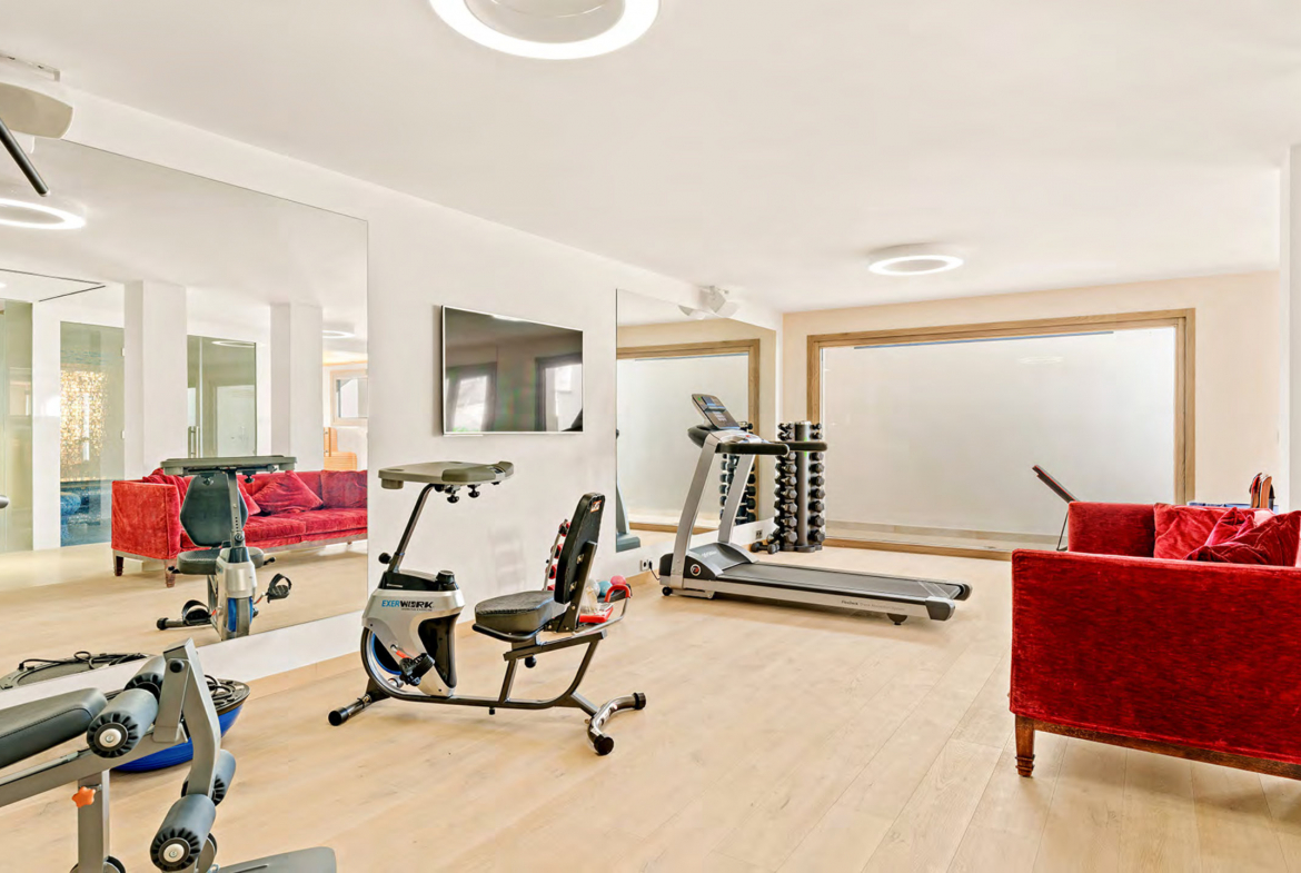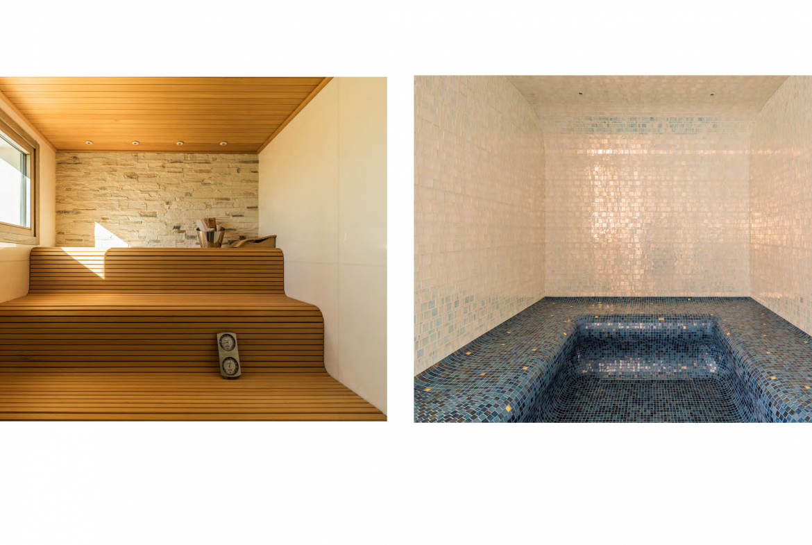 The lower floor focuses on relaxation, leisure, and functionality. A versatile guest or staff suite includes its own living room and kitchen. Moreover, this level features a private gym, a games room, and a dedicated spa area with sauna and steam bath. As a result, the villa offers a complete lifestyle environment designed for wellbeing and entertainment.