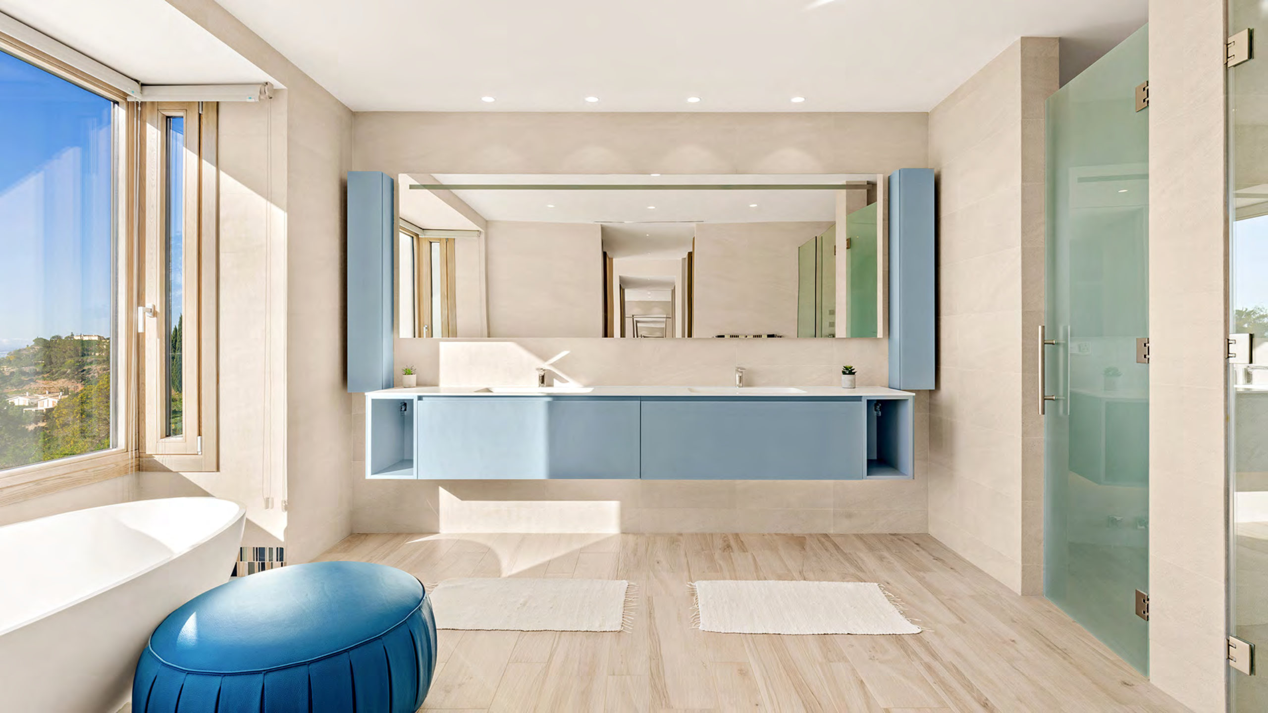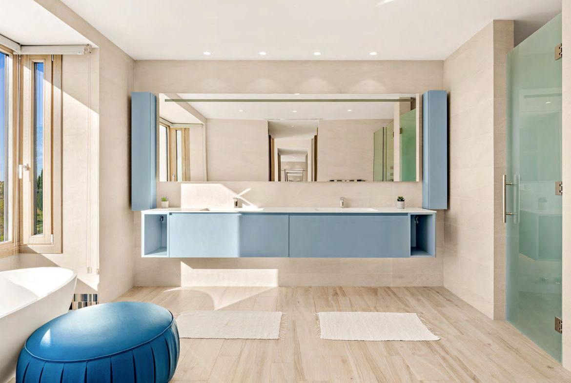Upstairs, the primary suite serves as a private retreat with exceptional sea views. It also benefits from direct access to its own terrace. Furthermore, two additional bedroom suites complete this level, each designed for privacy and comfort. Large windows amplify natural light and reinforce the villa’s calm, modern character.