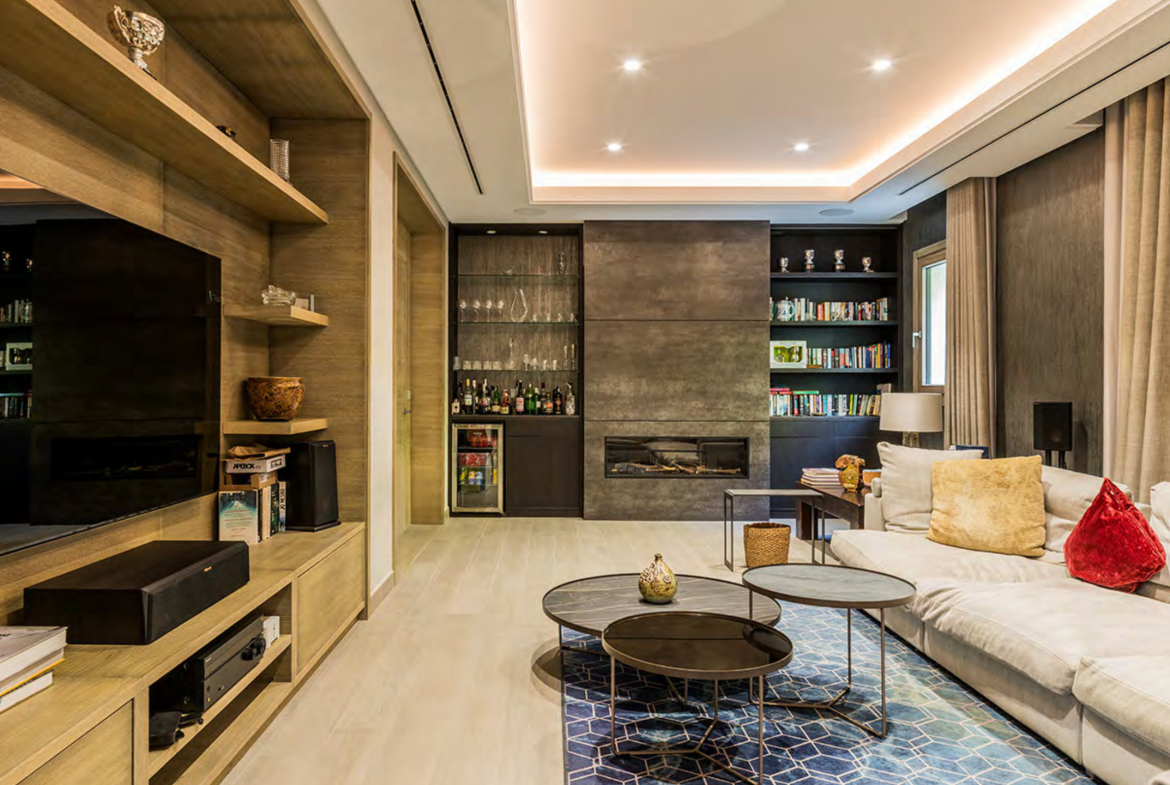 The main living room is bright, spacious, and visually connected to the outdoors. Floor-to-ceiling windows invite natural light while perfectly framing the surrounding views. The space opens directly onto the terrace and swimming pool, ensuring effortless indoor–outdoor living. This level also includes a private office, a formal dining area, and a contemporary kitchen with a dedicated breakfast corner. Additionally, a comfortable entertainment room with a bar and television enhances the social atmosphere.