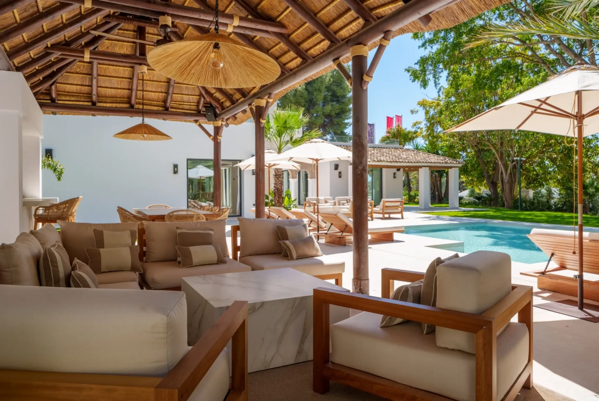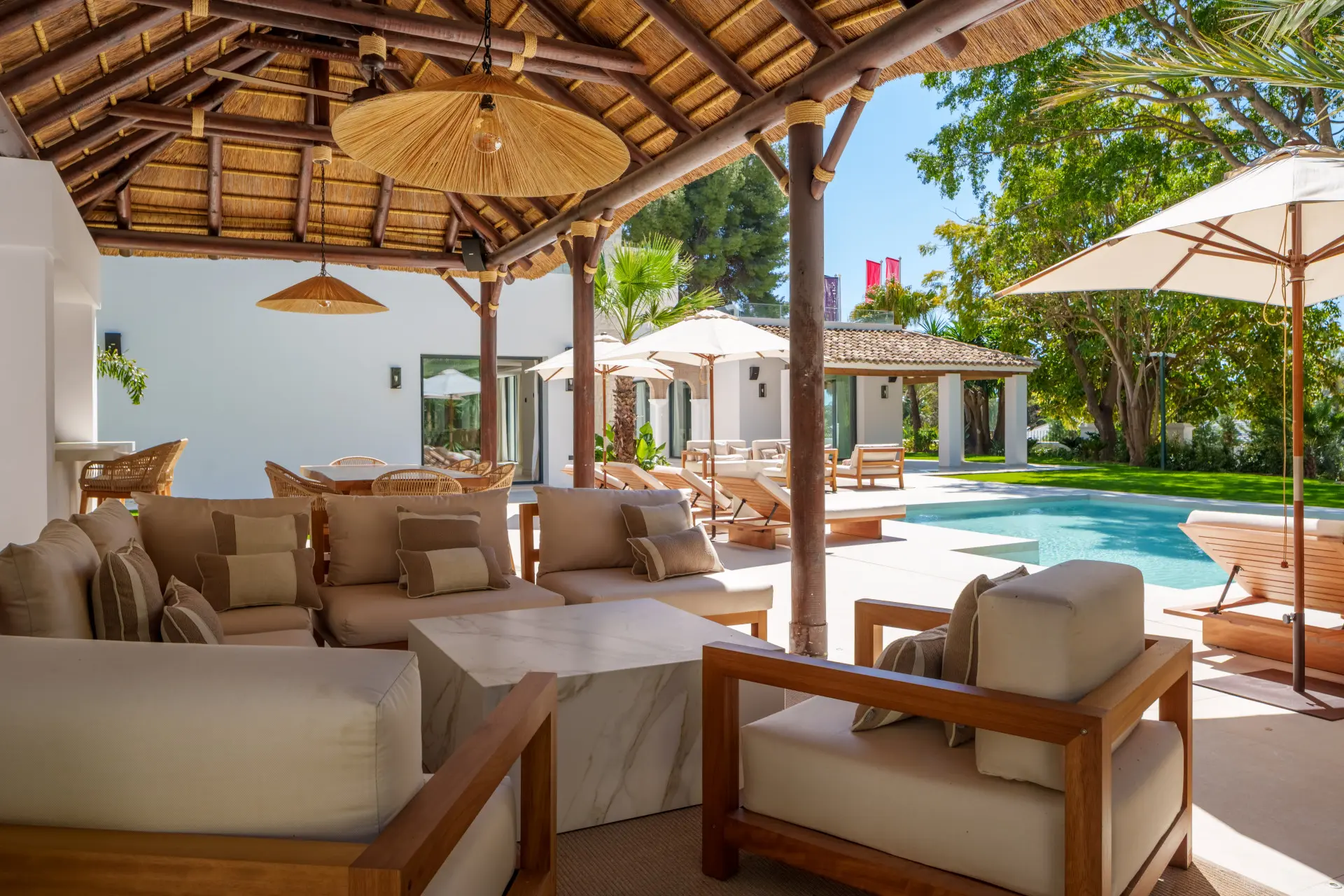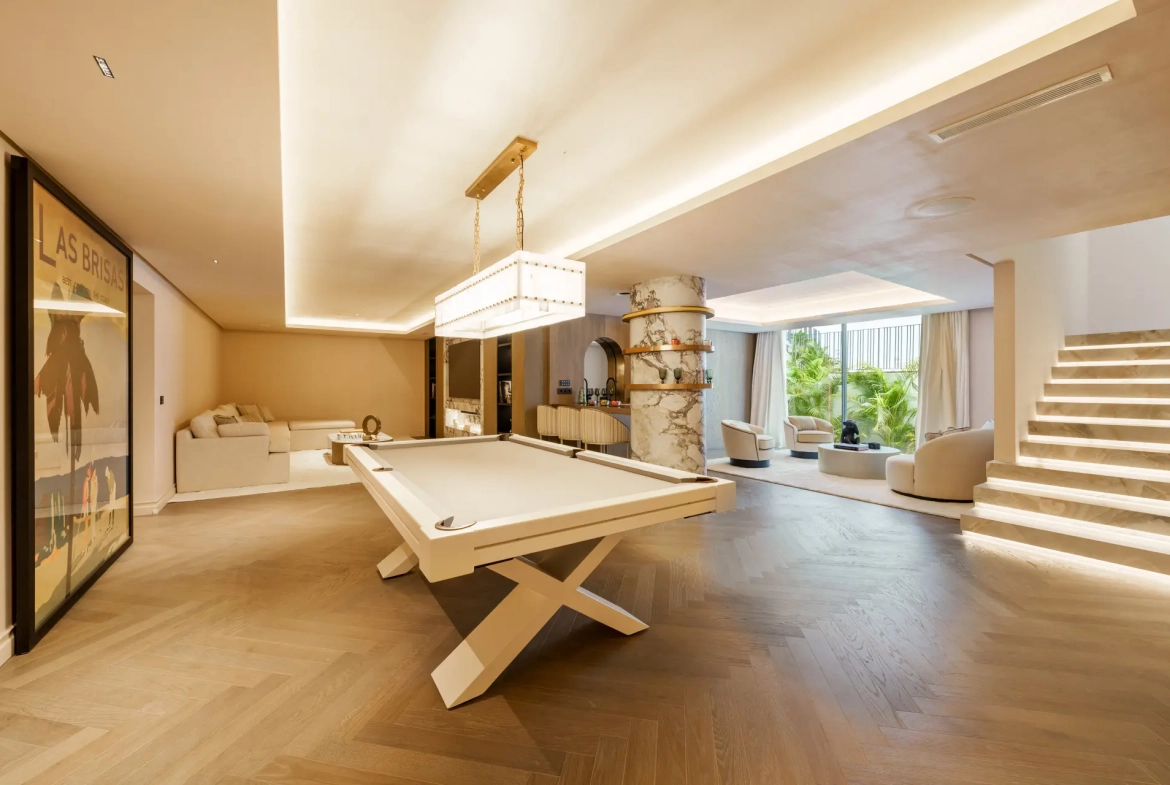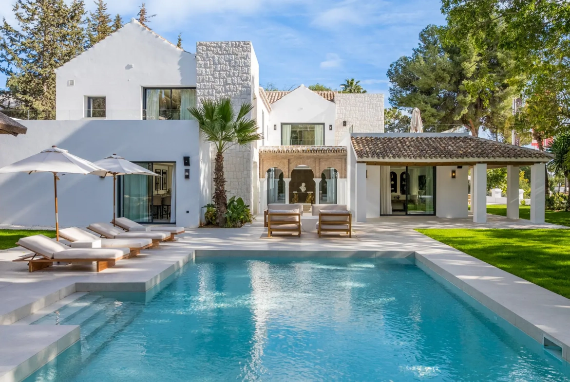 Villa “Las Palmeras” stands as one of Marbella’s finest residences, nestled in the prestigious Las Brisas area of Nueva Andalucia. This impressive villa spans 1256 m² across a vast 2560 m² plot, offering complete privacy and showcasing an incredibly beautiful, lush garden.