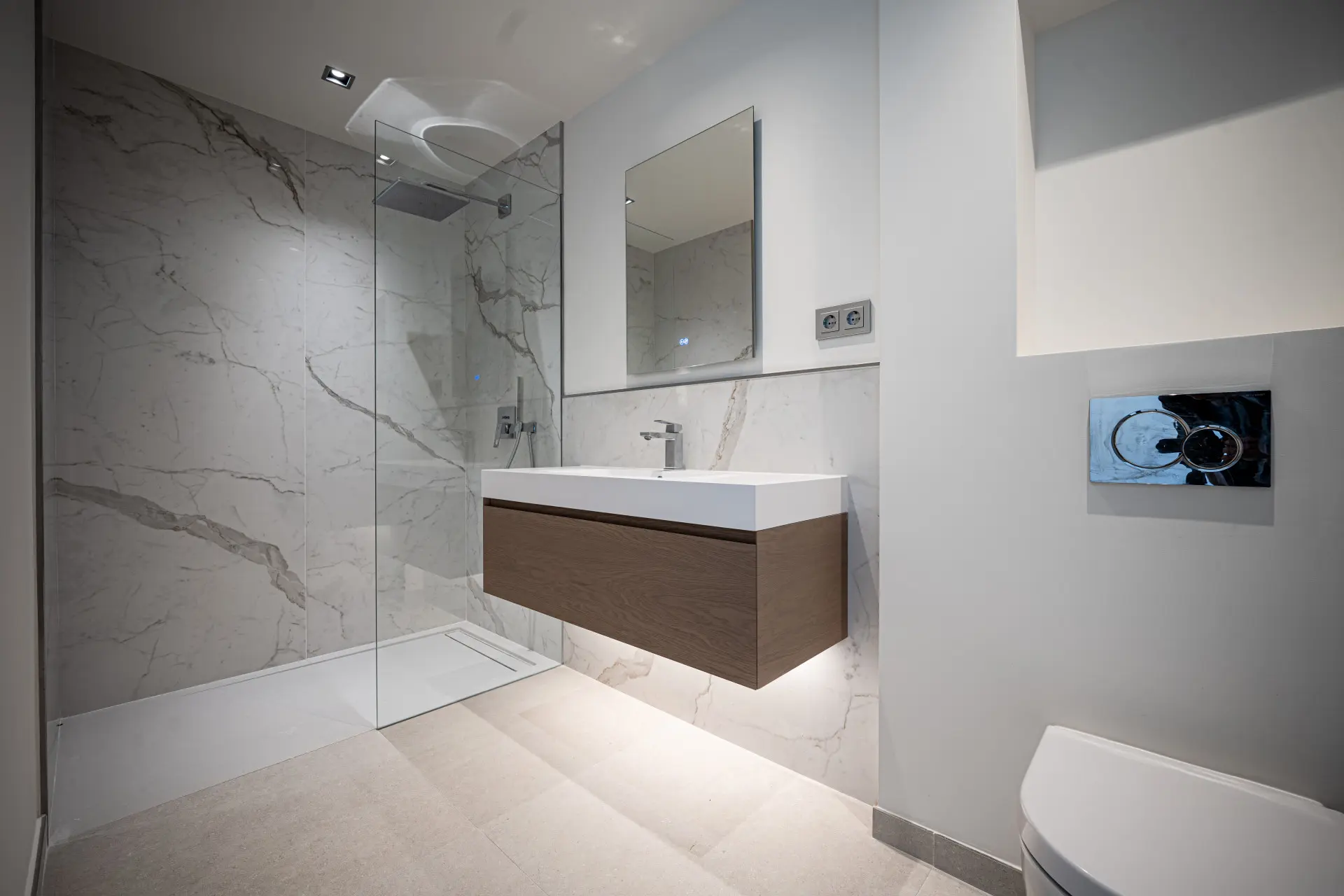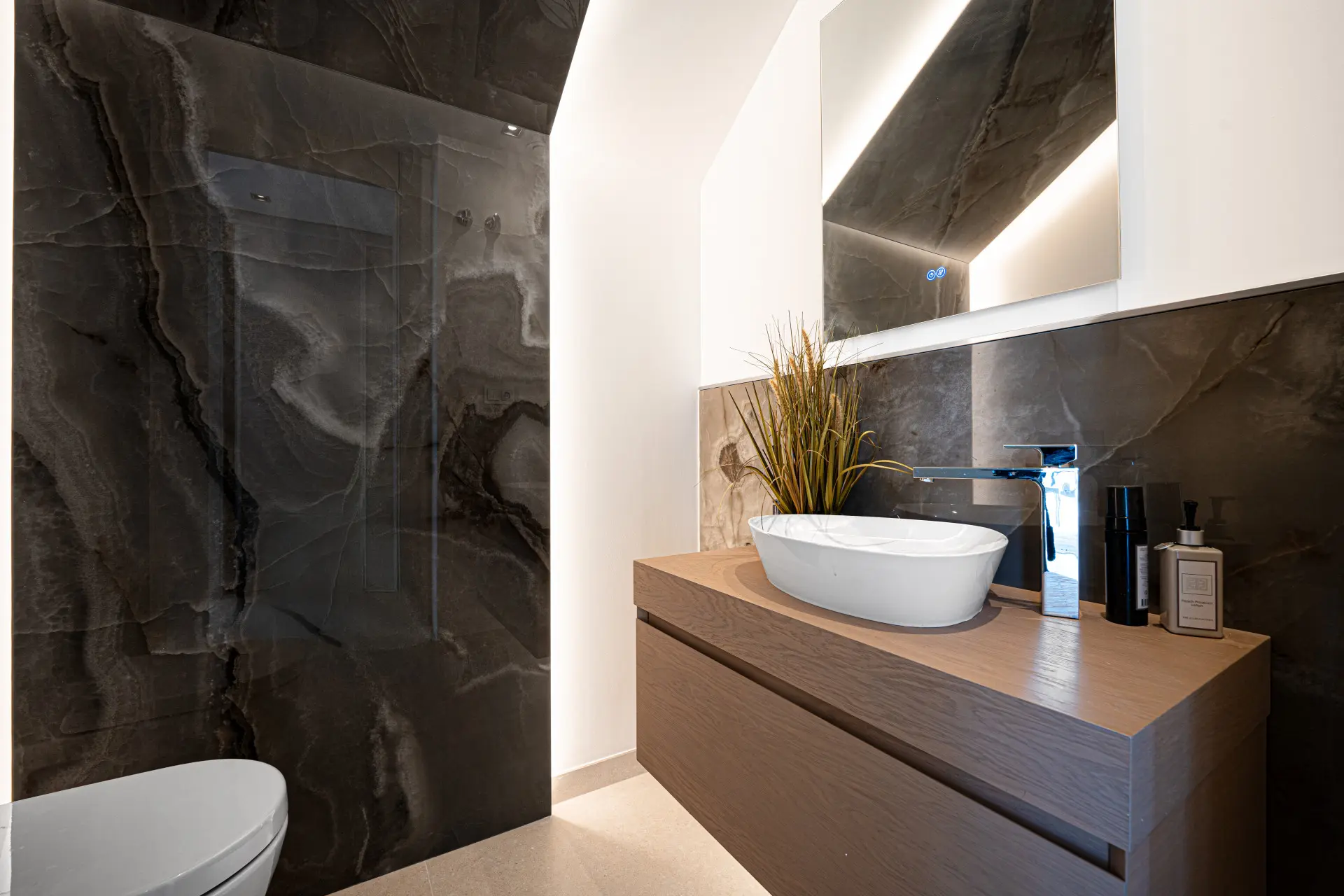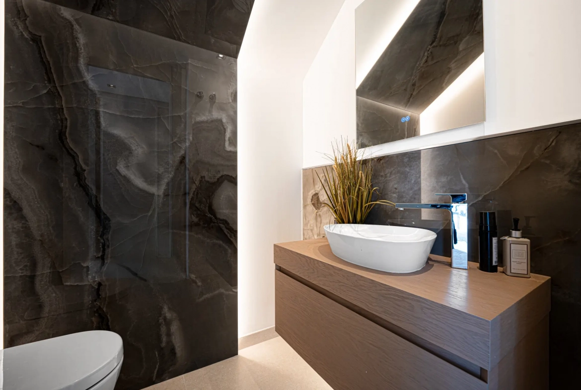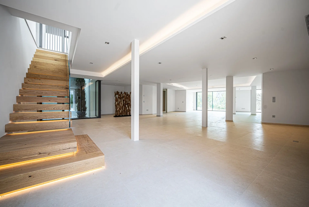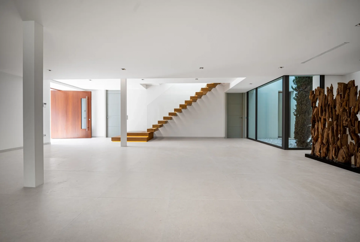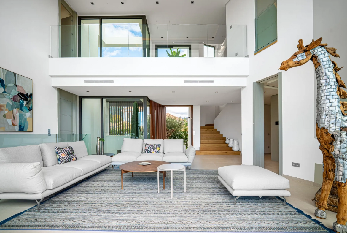 The villa offers a total built area of 764 m², complemented by 317 m² of terraces, and sits on a generous 1,377 m² plot. The architectural concept blends modern lines with natural elements, thereby creating a residence that feels both contemporary and visually harmonious with its Mediterranean surroundings.