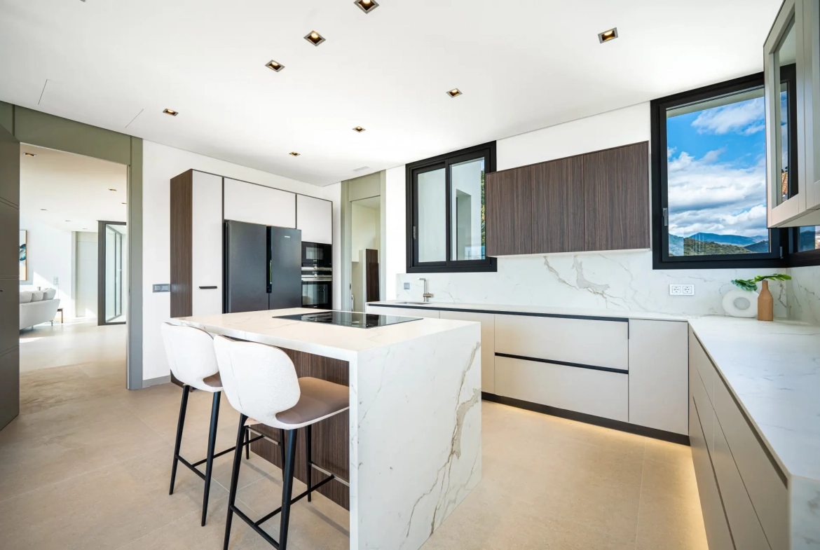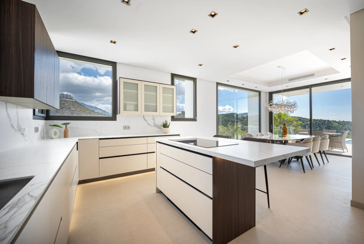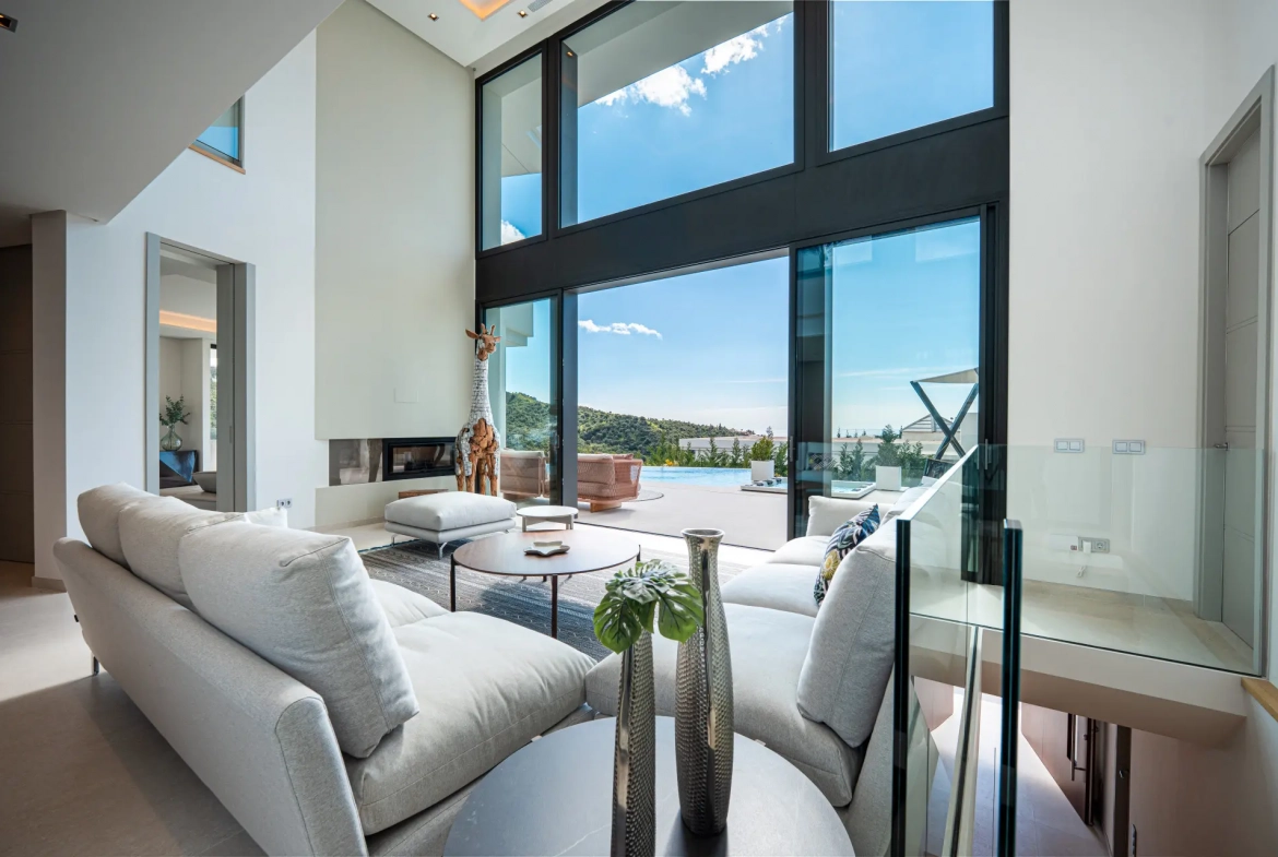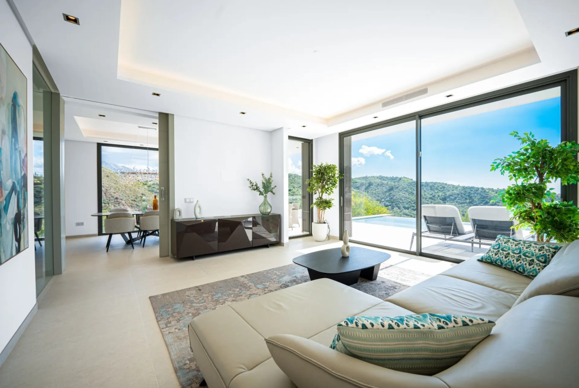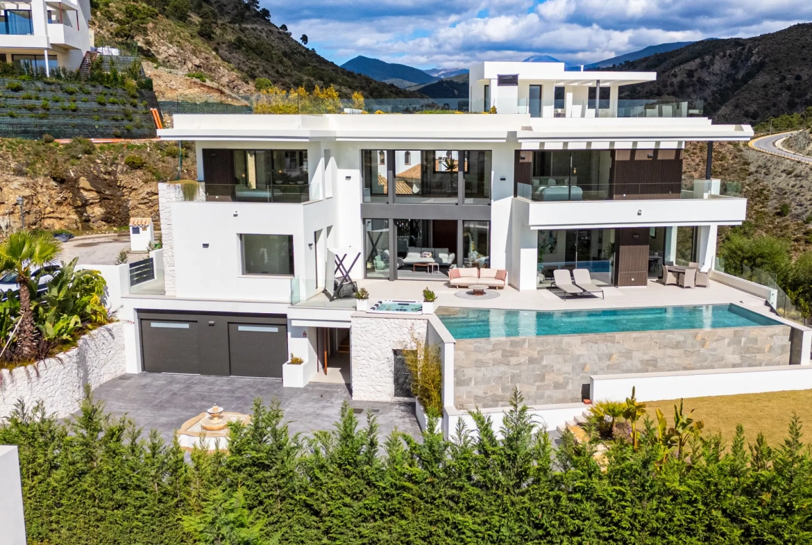 Thanks to its elevated position, the villa enjoys panoramic views of the Mediterranean Sea and the Sierra de las Nieves mountains. The surrounding natural landscape further enhances the sense of serenity and privacy.