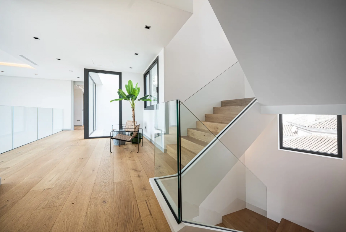The upper floor hosts the primary sleeping quarters. The master suite enjoys a privileged position, offering open views and a private en-suite bathroom. In addition, two further guest bedrooms complete this level, providing balanced accommodation for family and visitors.