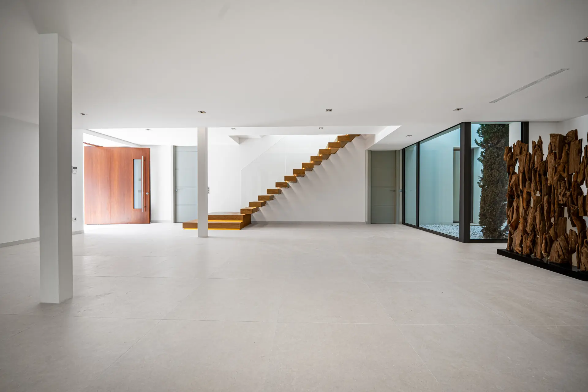 The exterior areas reflect the same attention to design and lifestyle. Two distinct garden spaces provide varied visual perspectives, one oriented toward both sea and mountain views and the other focused on the mountainous backdrop. Consequently, the property delivers multiple outdoor experiences throughout the day.