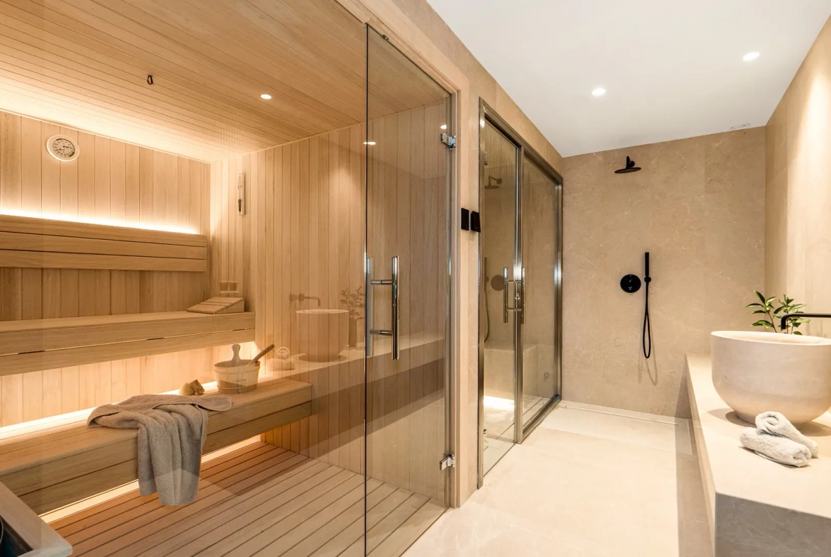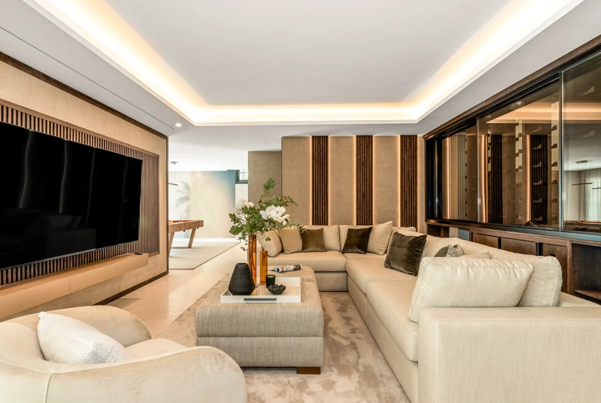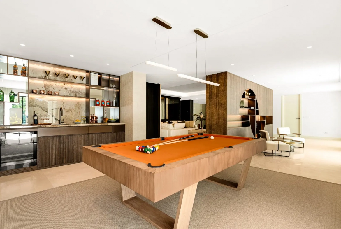 For relaxation and wellbeing, the villa includes a dedicated wellness area with a spa, sauna, hammam, and fully equipped gym. Furthermore, an elegant games and family room enhances the lifestyle offering, featuring a billiard table, custom bar, and temperature-controlled wine display. Upstairs, a private terrace with a jacuzzi provides the perfect setting to enjoy panoramic views and Marbella’s celebrated sunsets.
