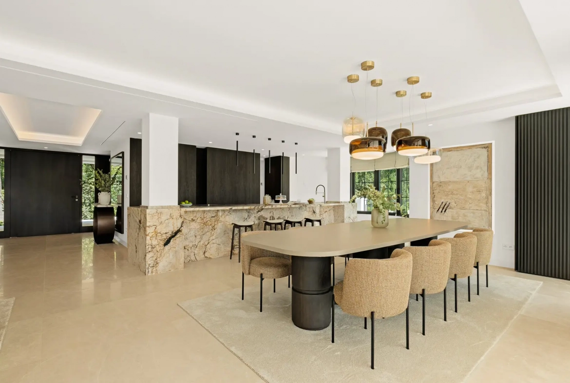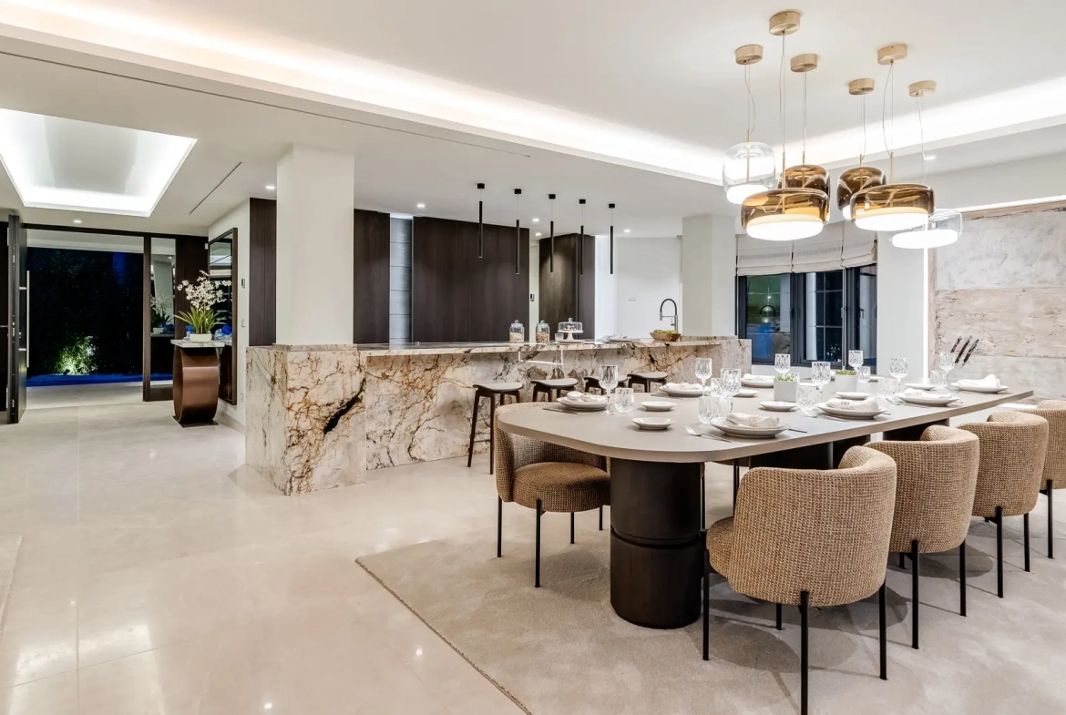 A grand entrance introduces bright, open-plan interiors filled with natural light. Thanks to its southwest orientation, the villa enjoys sunlight throughout the day while capturing beautiful views. At the heart of the home, a striking designer kitchen with a sculptural marble island connects seamlessly with the dining and lounge areas. Consequently, the layout promotes both everyday comfort and elegant entertaining. Bespoke finishes, refined materials, and meticulous craftsmanship define every space.