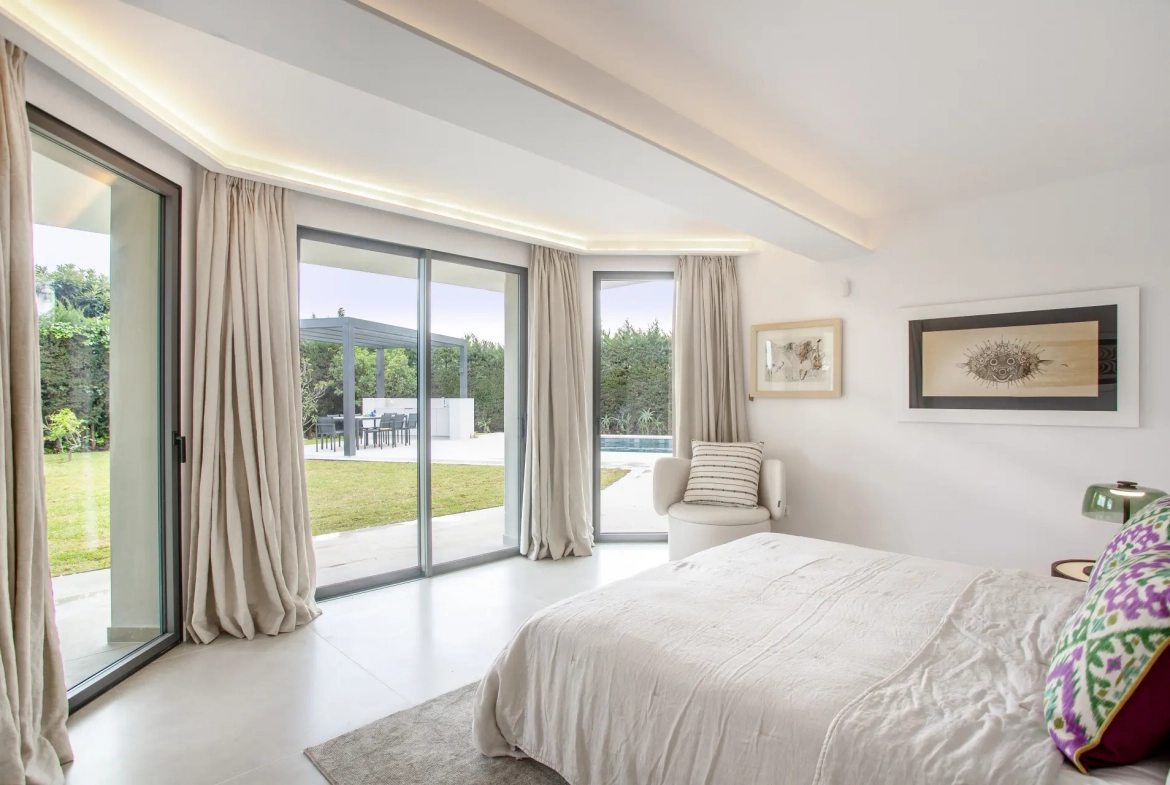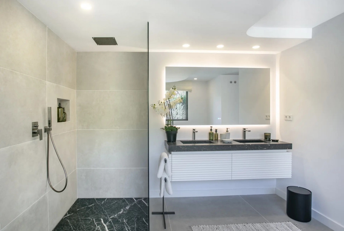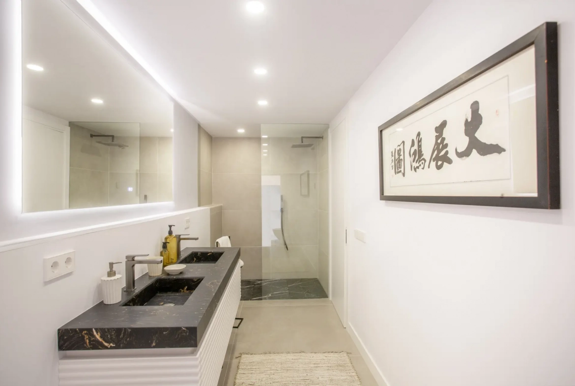 The renovation emphasizes modern comfort and energy efficiency. The villa includes underfloor heating, central air conditioning with Air Zone control, and high-quality ceramic and microcement flooring. Additional features, such as a gas fireplace and pre-installation for solar and photovoltaic panels, further enhance the property’s performance and future adaptability.