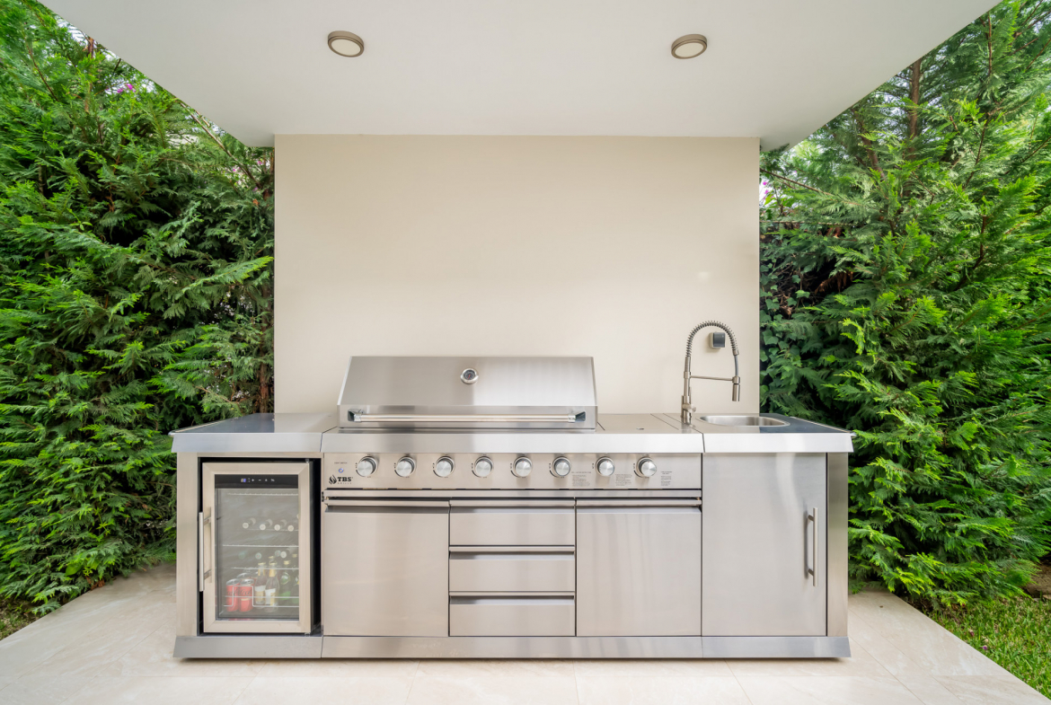 A fully equipped outdoor kitchenette with barbecue further elevates the villa’s leisure appeal. Therefore, the exterior spaces function as a natural extension of the interior living areas.