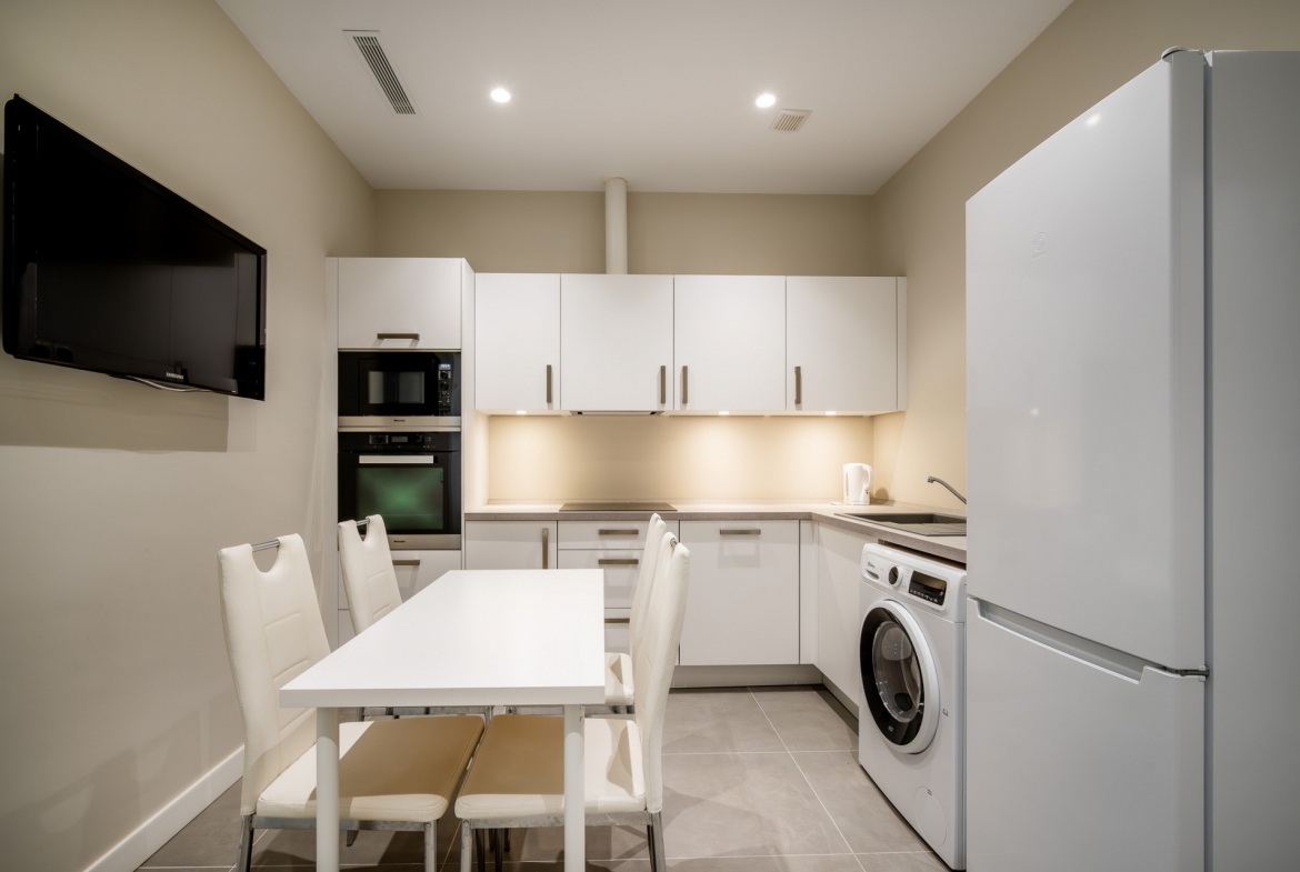 The ground level seamlessly connects indoor and outdoor living, with direct access to the terraces. Inside, the villa showcases elegant Italian furnishings, a comfortable lounge area, and a spacious dining room complemented by a wine bodega. In addition, the modern kitchen offers generous storage capacity and practical design.